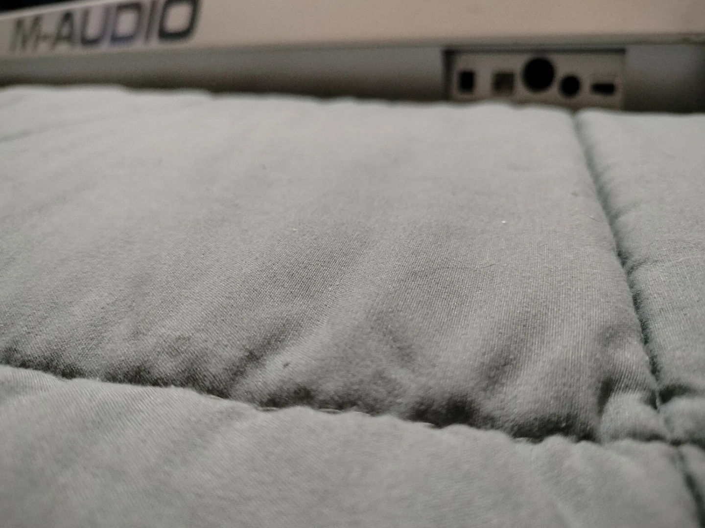 This is an M-Audio Axiom 49 MIDI keyboard controller. It has 49 keys. It includes pitch and modulation wheels.