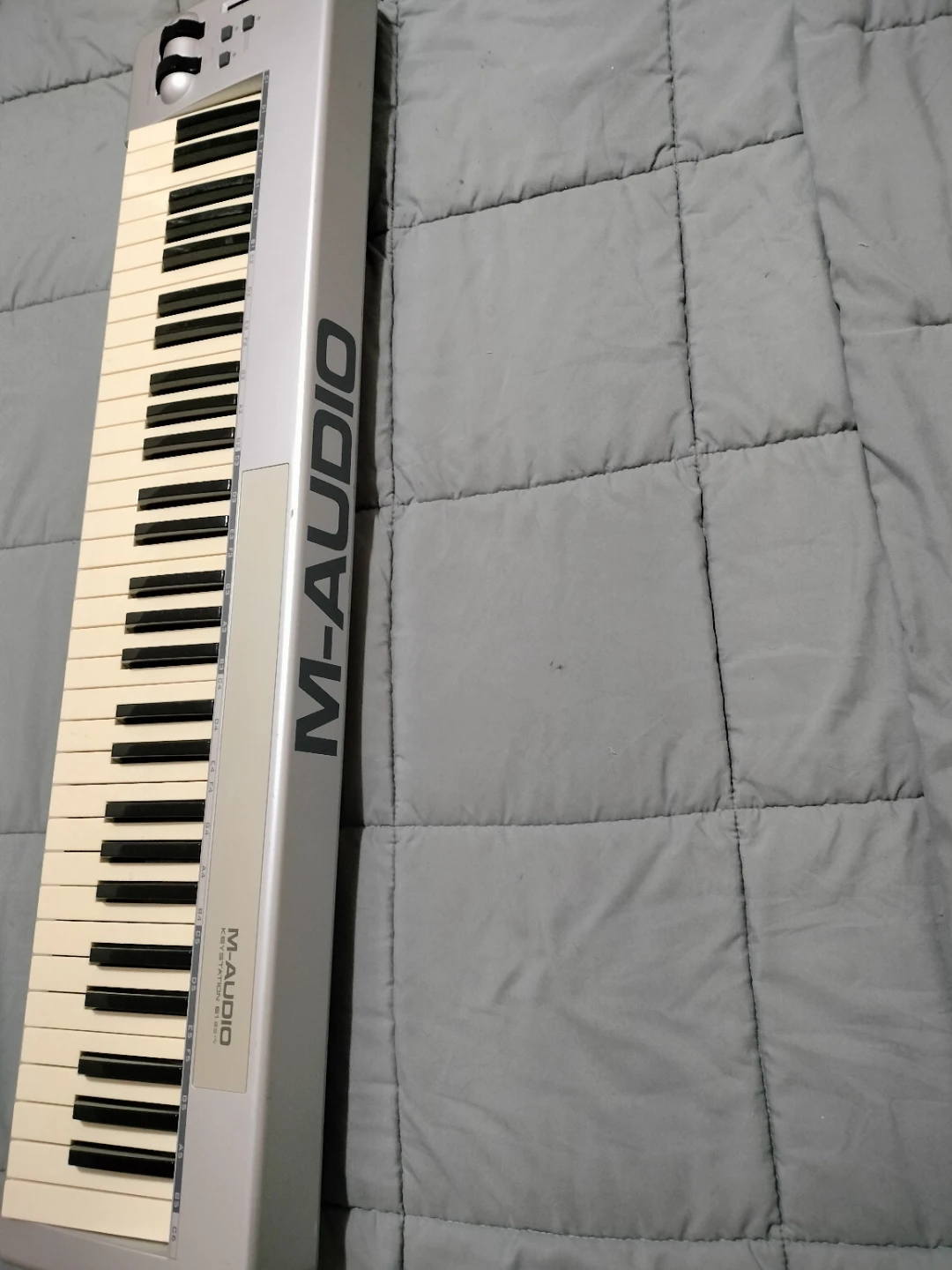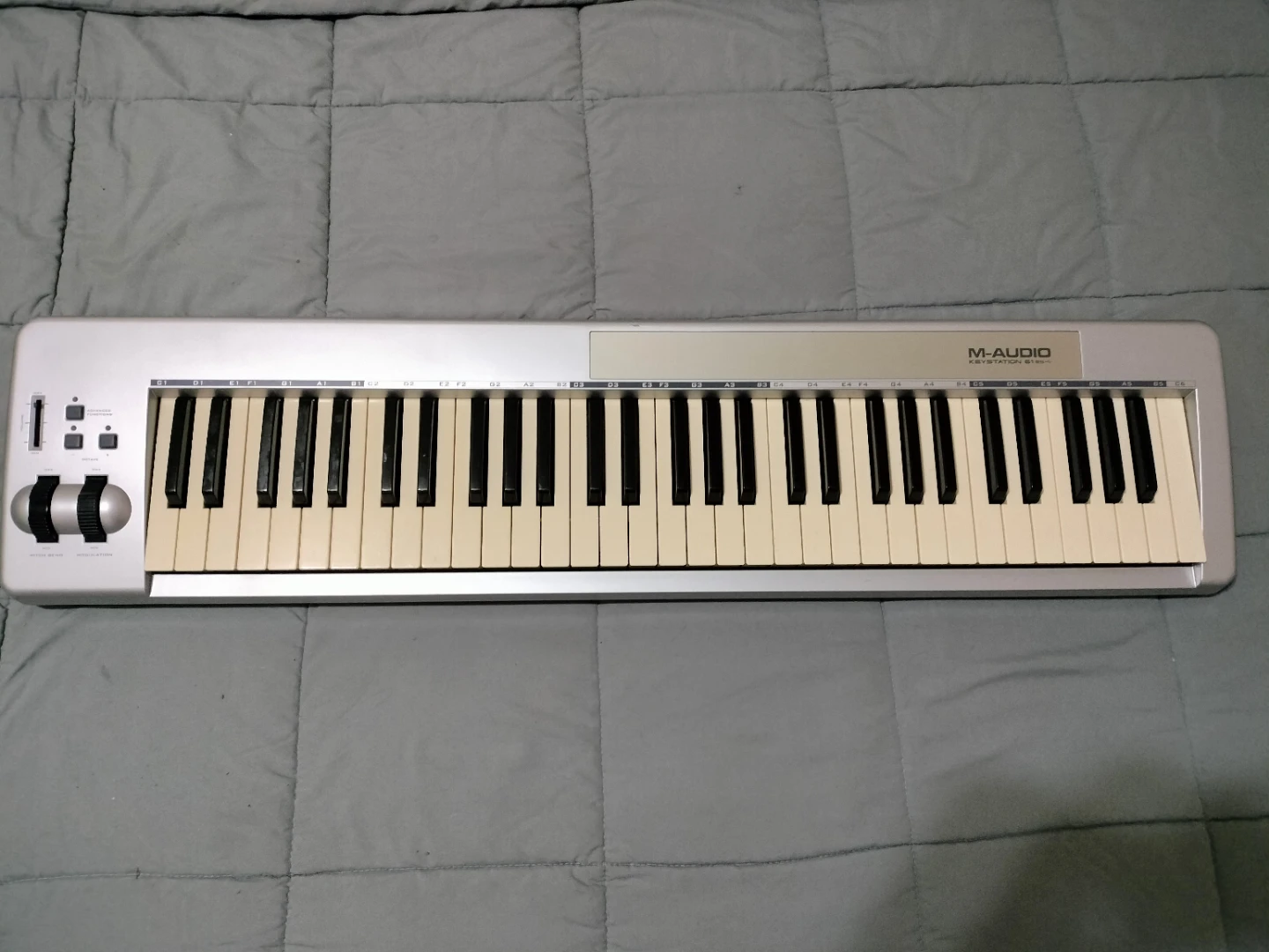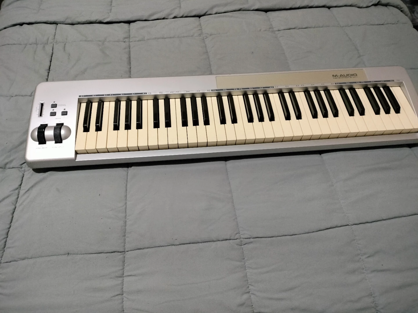 This is an M-Audio Axiom 49 MIDI keyboard controller. It has 49 keys. It includes pitch and modulation wheels.