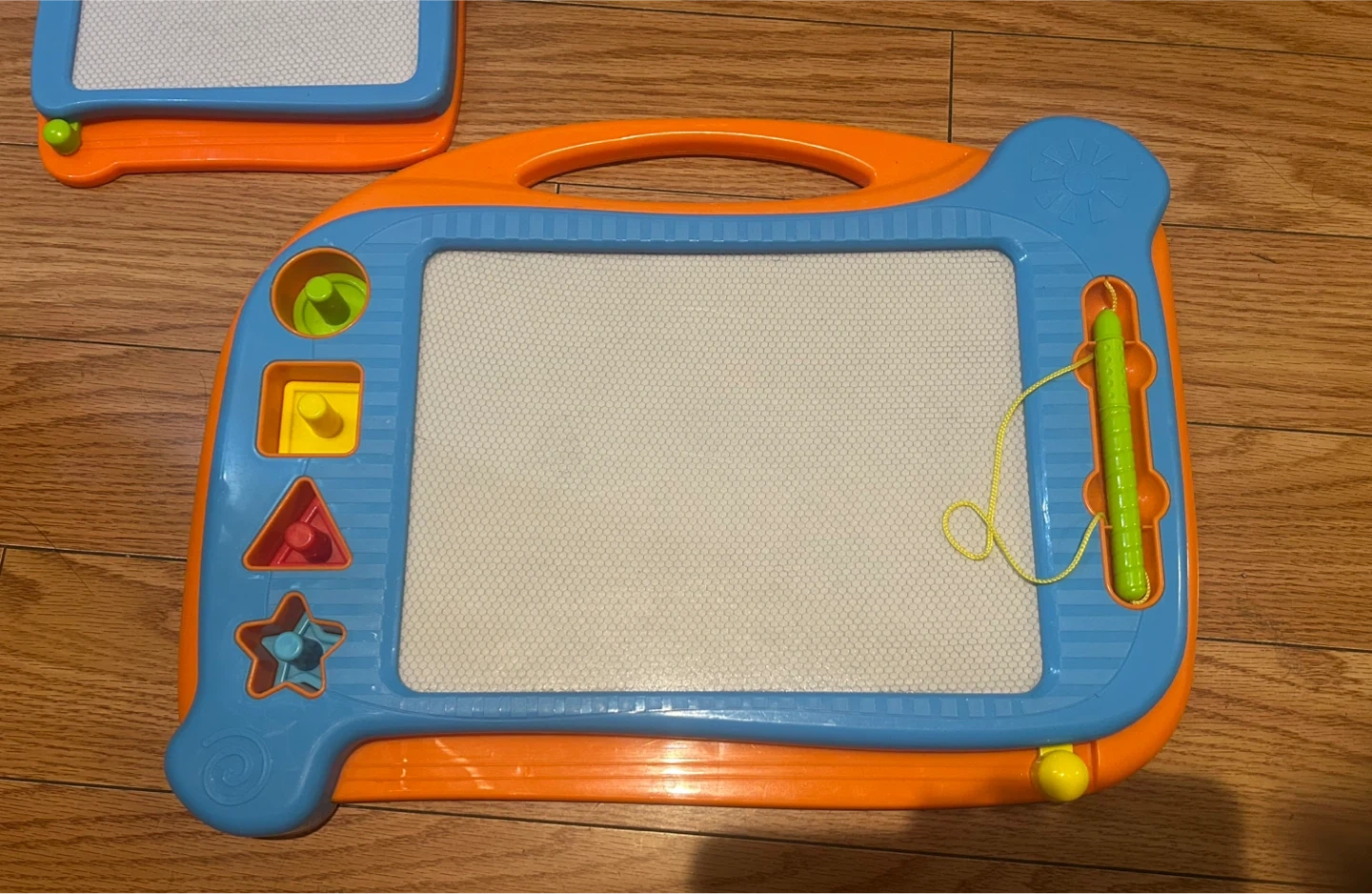 Two magnetic drawing boards for kids, one larger and one smaller. They come in blue and orange with green styluses. Includes shape stamps for added fun!