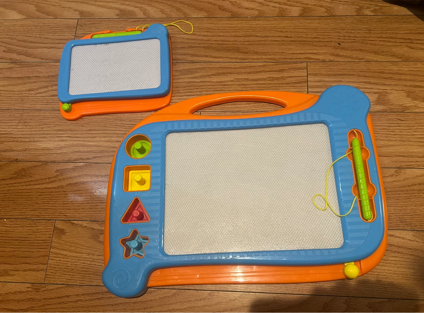Two magnetic drawing boards for kids, one larger and one smaller. They come in blue and orange with green styluses. Includes shape stamps for added fun!