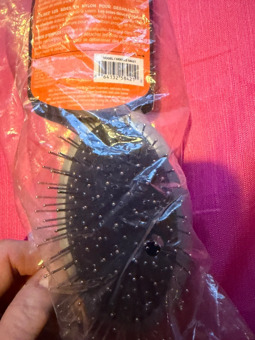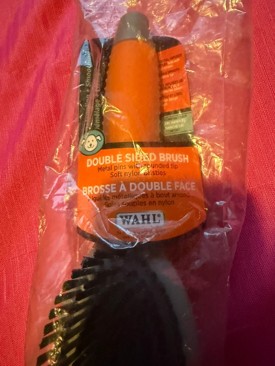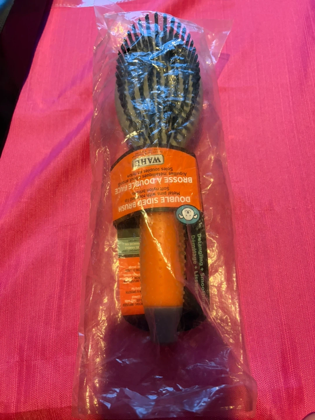 This Wahl Double Sided Brush features metal pins with rounded tips for detangling and soft nylon bristles for smoothing. It's designed for gentle use on pets. Perfect for grooming your furry friends! Paid $14
