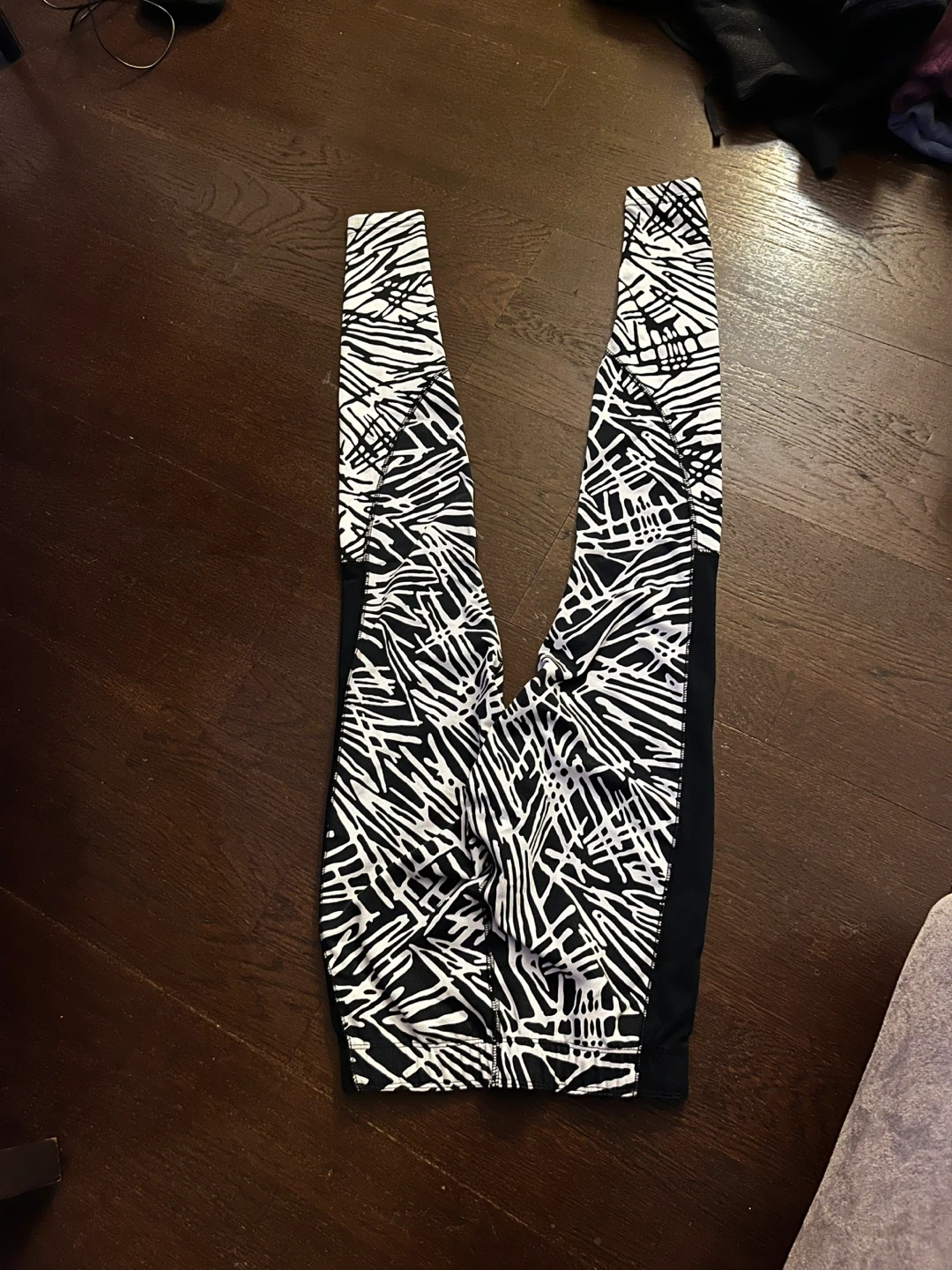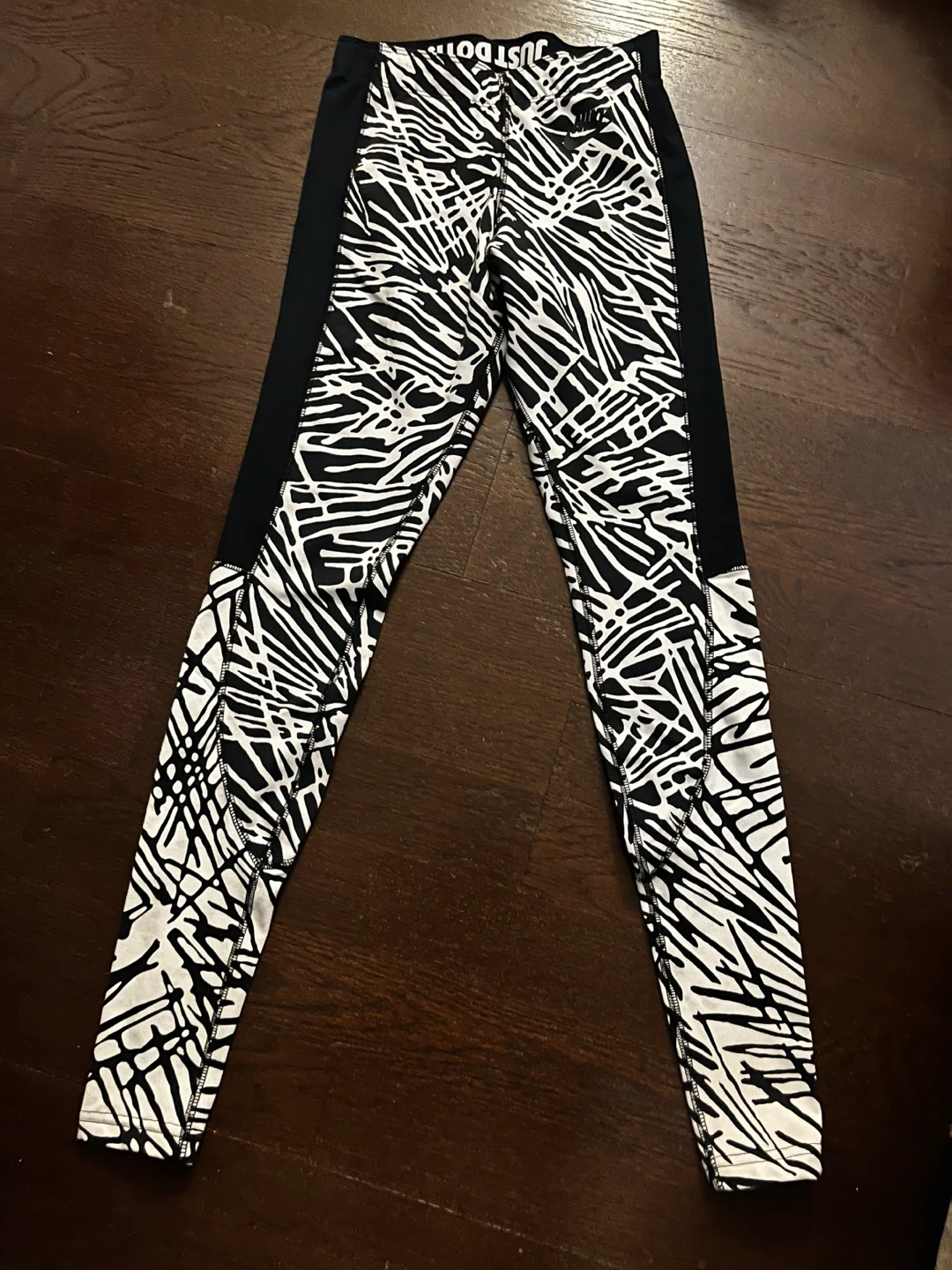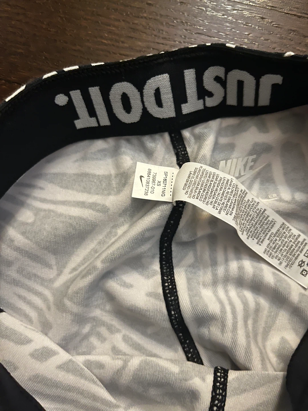 Nike leggings with a black and white pattern. They're a size XS and feature the "Just Do It" waistband. Perfect for workouts or everyday wear!