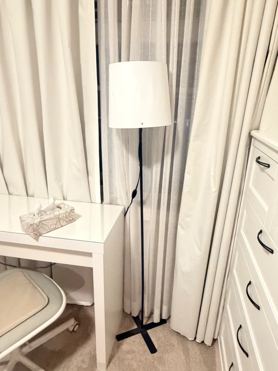 This is a white floor lamp with a black stand and a fabric shade. It's powered by electricity and would be great for adding light to any room.