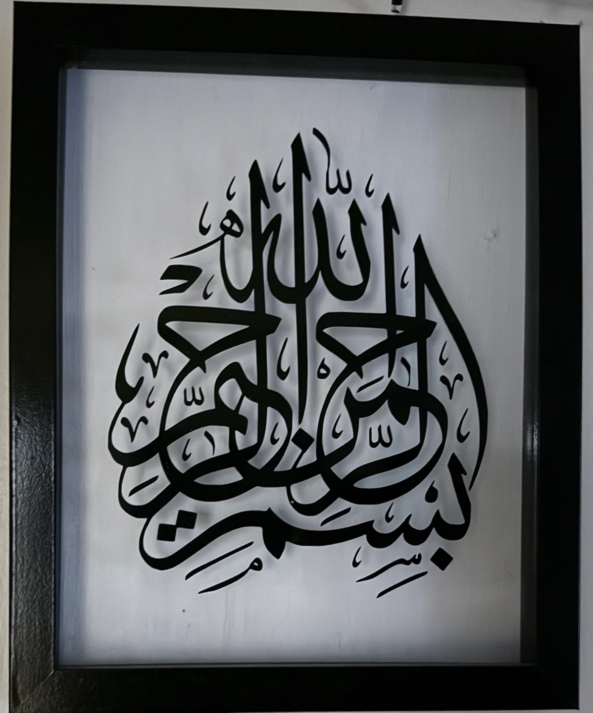 The piece features elegant calligraphy art. It has a black frame. Placing this in your home can provide a sense of peace.