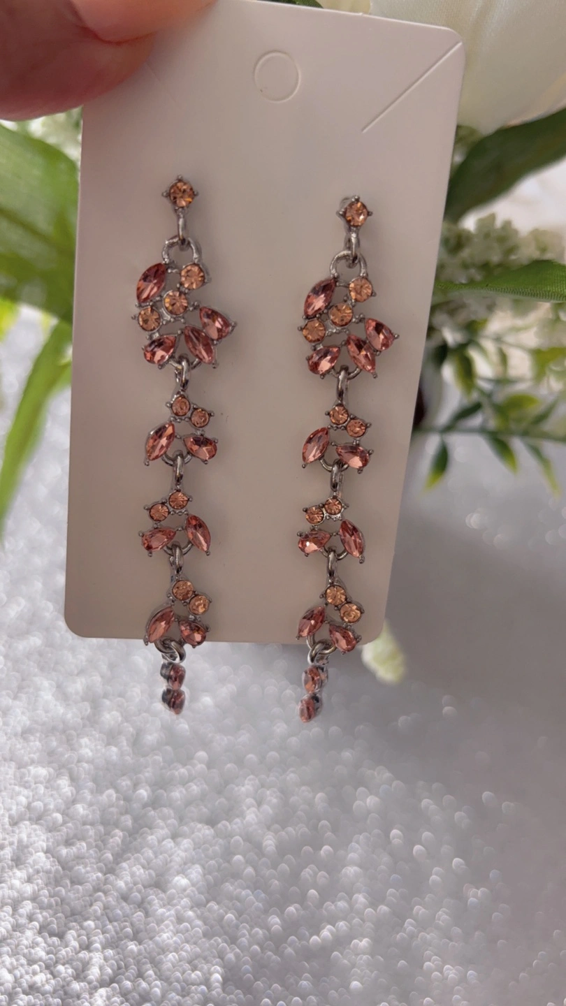 Gorgeous long drop earrings. Features peach coloured crystals. Silver tone metal. Perfect for any occasion.