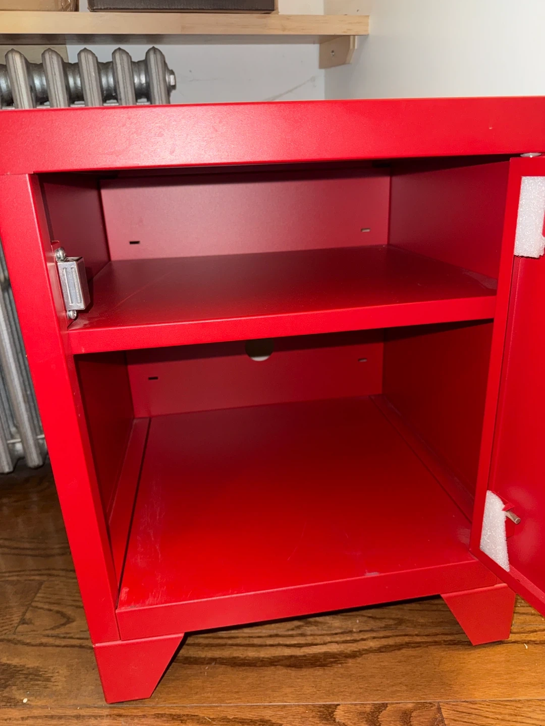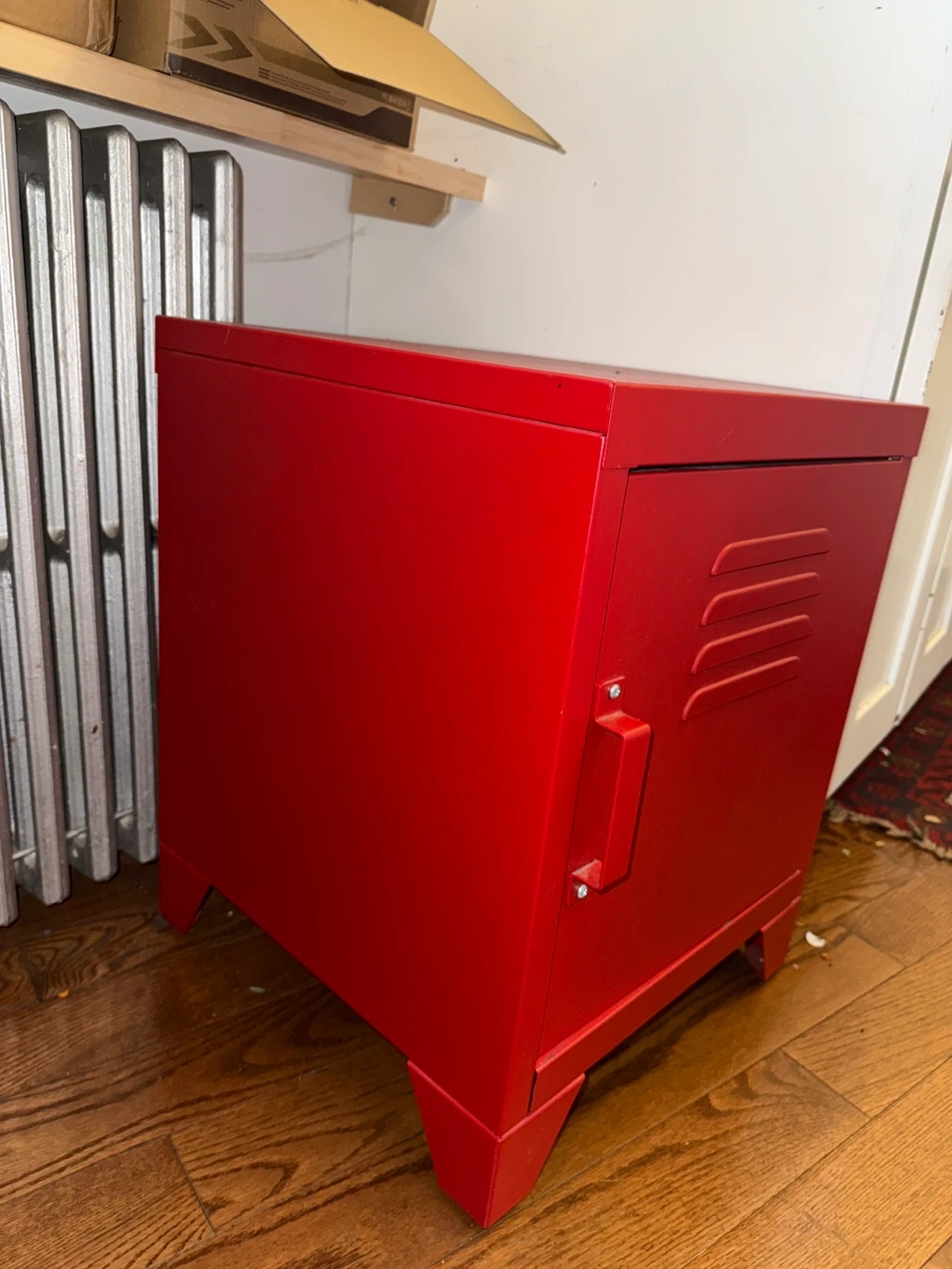 This is a red, locker-style side table or cabinet. It has a metal construction with a single door and two interior shelves. The door features a louvered design for ventilation. It's perfect for use as a nightstand or small storage unit!