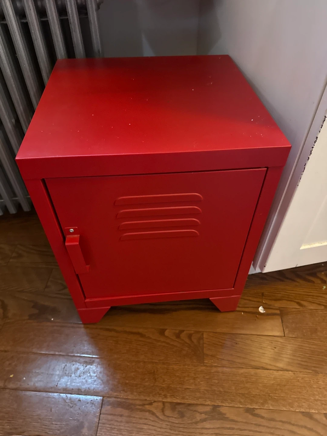 This is a red, locker-style side table or cabinet. It has a metal construction with a single door and two interior shelves. The door features a louvered design for ventilation. It's perfect for use as a nightstand or small storage unit!