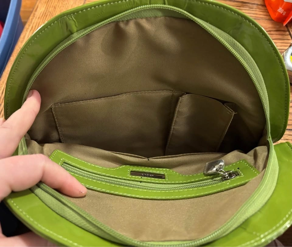 Great shape. Unique bright green vinyl purse. Semicircle shape, with both shoulder strap and handles. Outer pocket is a clamshell closure, very unique. Main pocket is zippered, with cute heart shaped zipper pull. Inside has two open pockets on one side, and one zippered pocket and card slots on the other. All zippers work great. Some mild wear on the handles and one small scrape on the top edge is the only signs of wear. 12”x9”, 2.5” thick empty. Cash or e-transfer accepted.