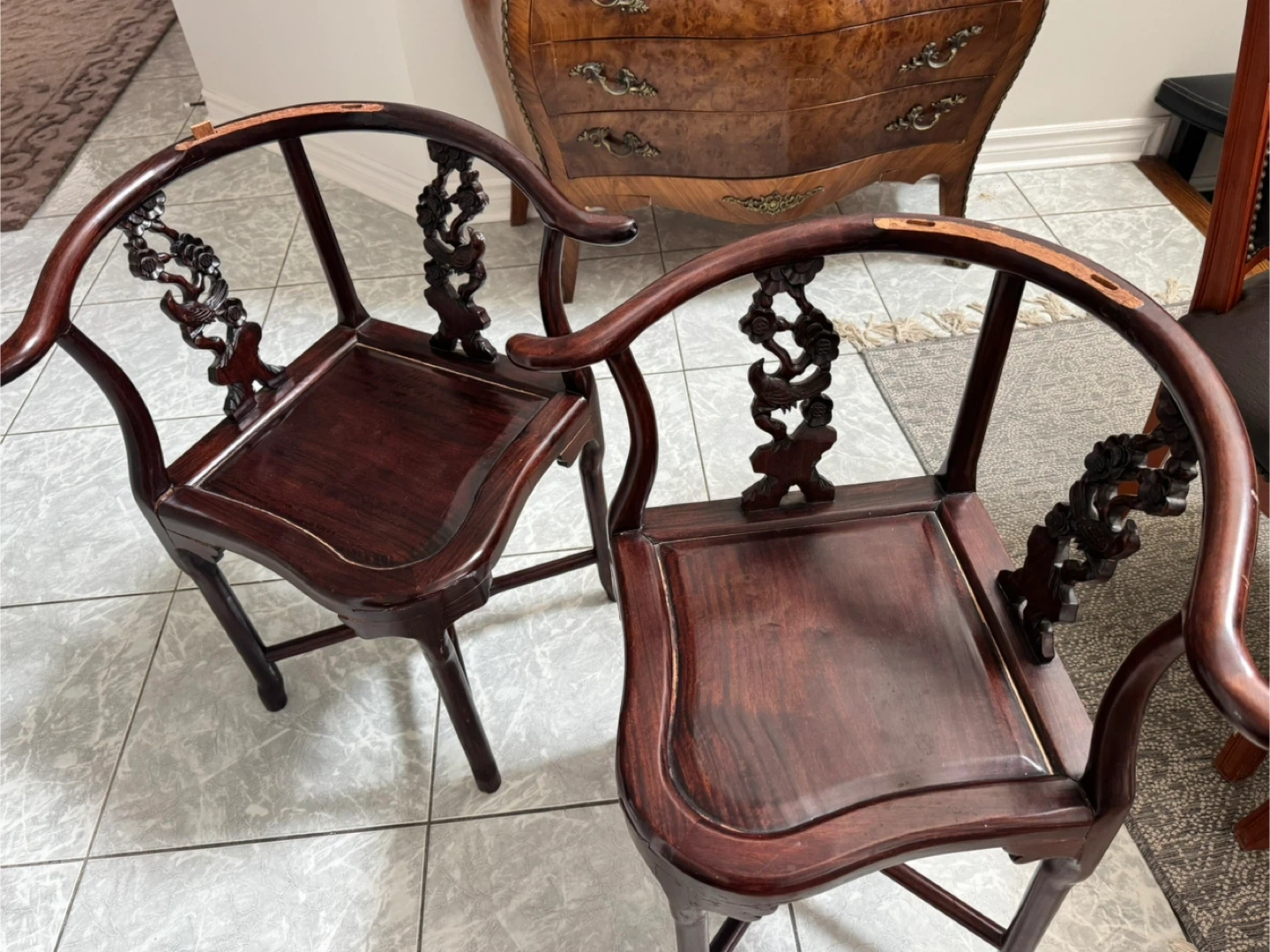 A pair of wooden corner chairs. Features curved arms and decorative carvings. Dark wood finish. These chairs are suitable for traditional living spaces. Condition as shown in photos.