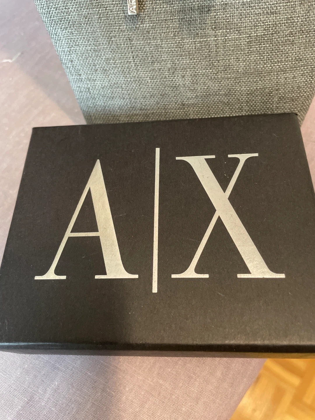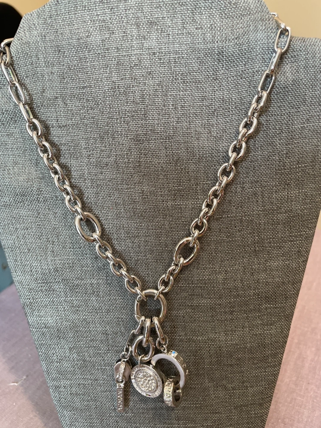 This AX Armani Exchange necklace features a silver-toned chain with multiple charms, including a sparkling circular pendant and other decorative pieces. One charm has 'ARMANI' engraved on it. It comes in its original box. 19”- 22”
