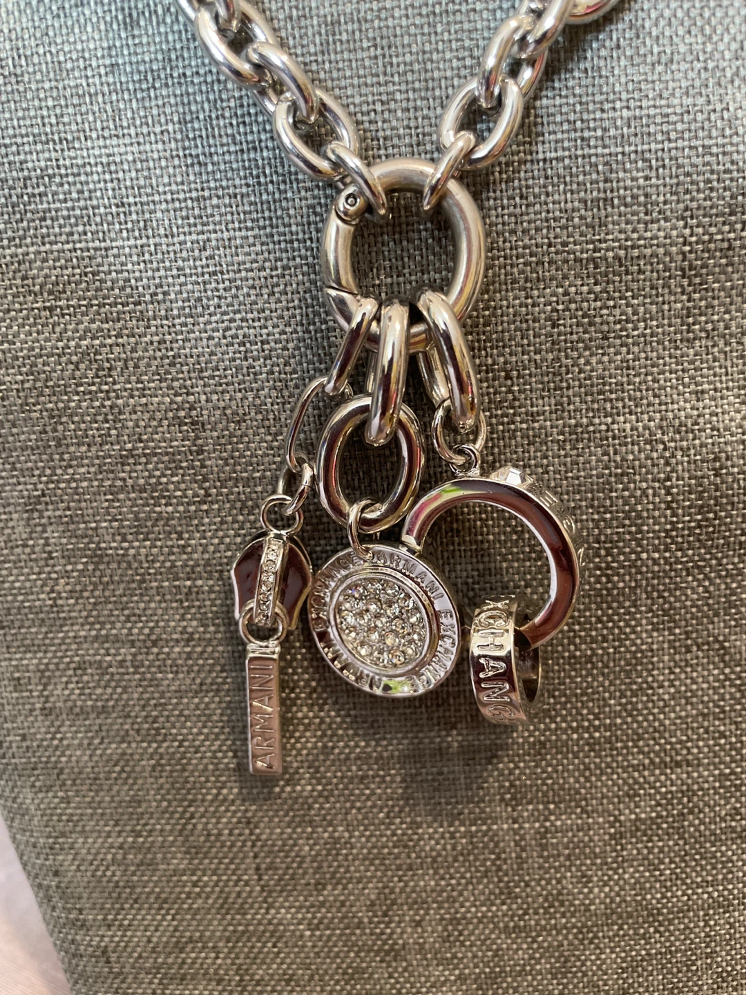 This AX Armani Exchange necklace features a silver-toned chain with multiple charms, including a sparkling circular pendant and other decorative pieces. One charm has 'ARMANI' engraved on it. It comes in its original box. 19”- 22”