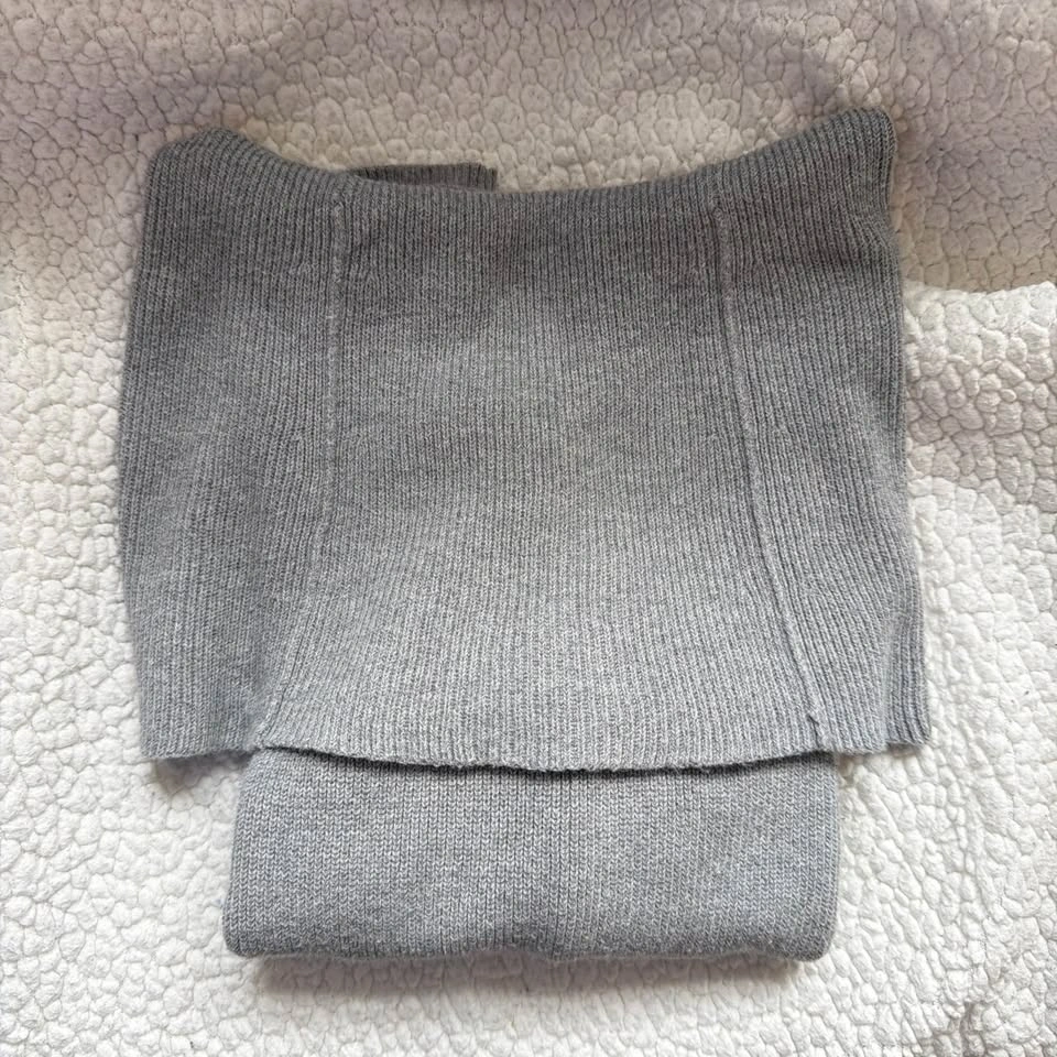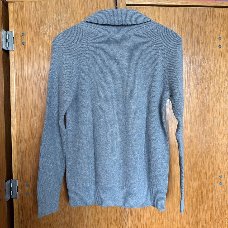 Lightweight cowl neck sweater in soft gray. Slim, relaxed silhouette with long sleeves. Fine knit with ribbed hem and cuffs. Easy layering piece for everyday wear. Size M.