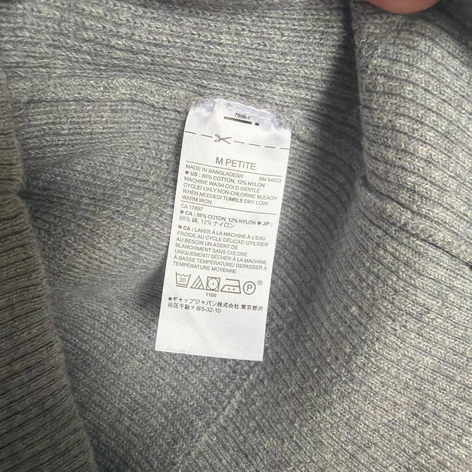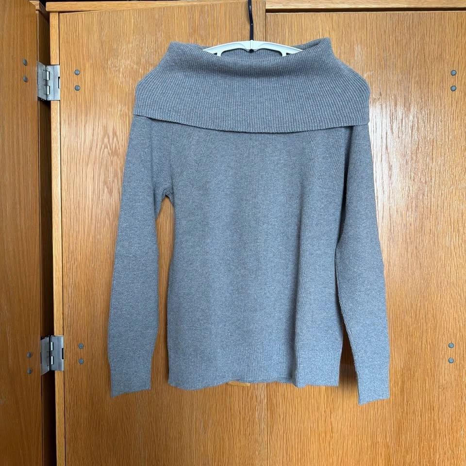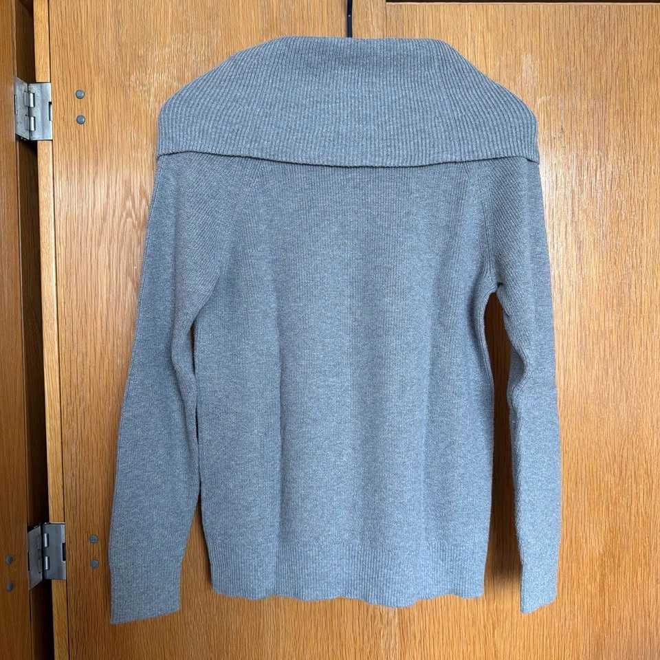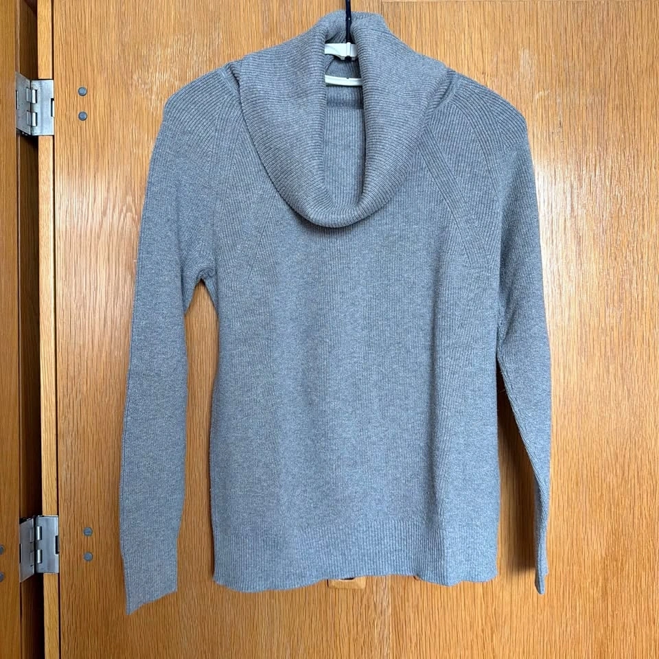 Lightweight cowl neck sweater in soft gray. Slim, relaxed silhouette with long sleeves. Fine knit with ribbed hem and cuffs. Easy layering piece for everyday wear. Size M.