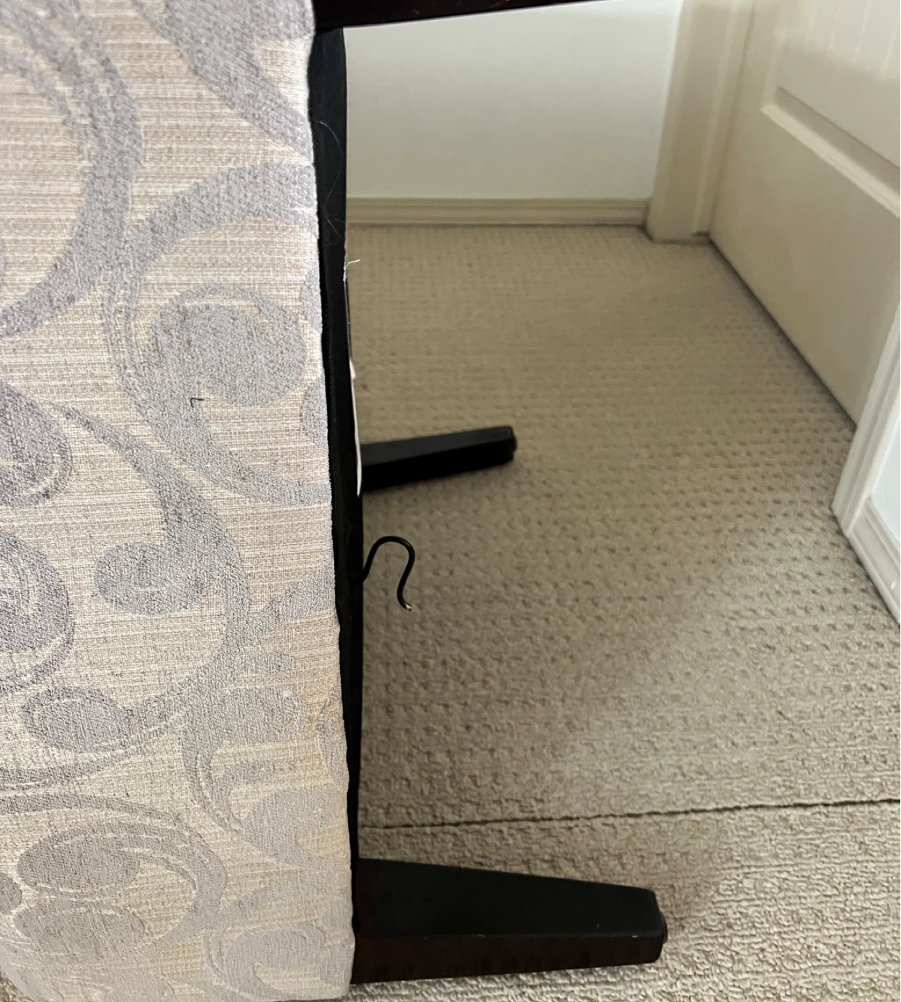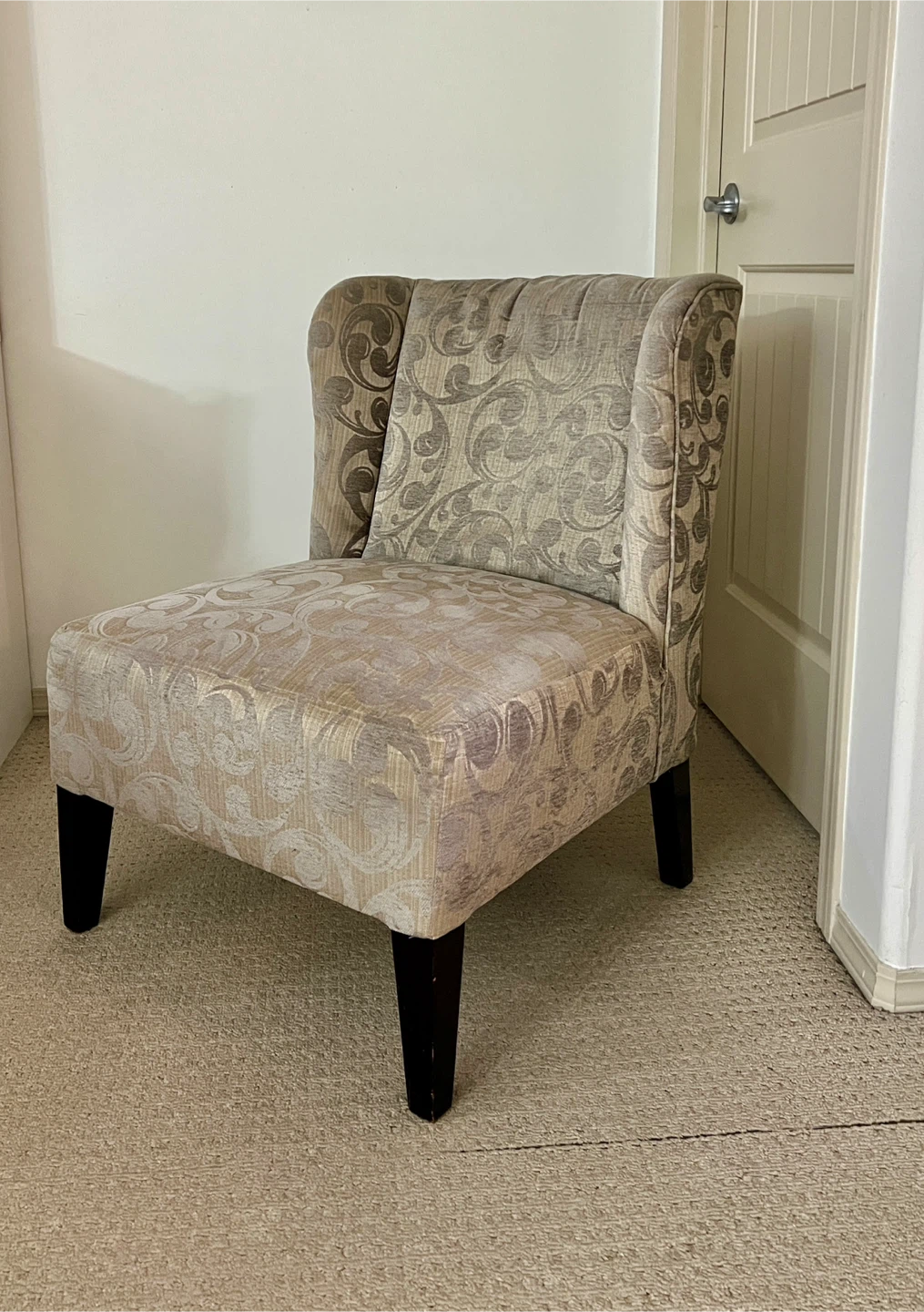 Upholstered accent chair with patterned fabric and dark wooden legs. One spring has popped out, but it’s still comfy to sit on. Would be an easy fix for someone handy and perfect as a statement piece in any room.