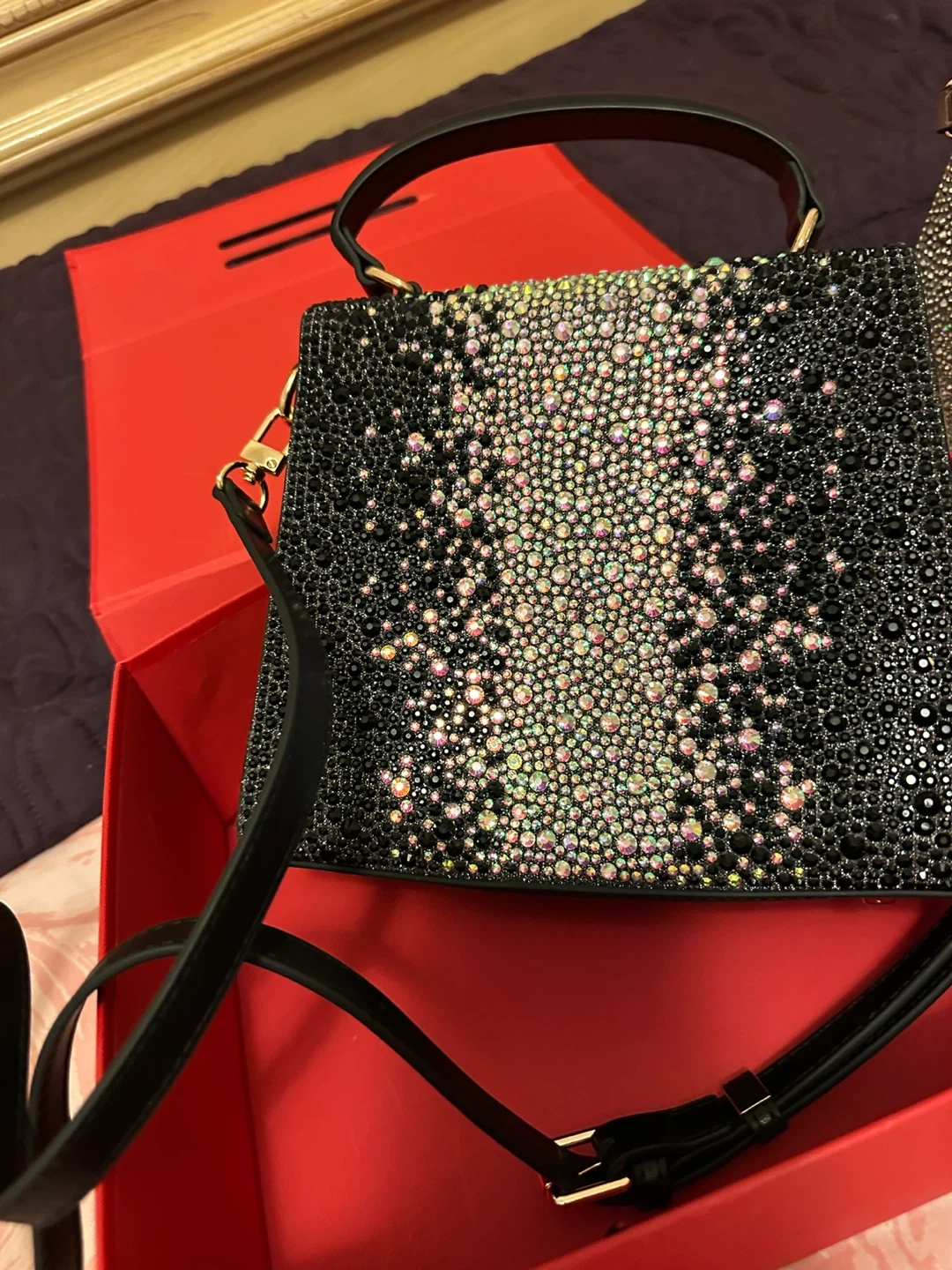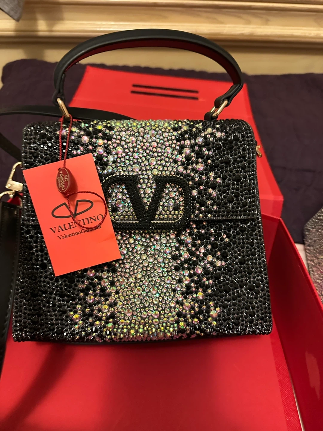 Valentino Garavani black handbag covered in crystals. Features a VLogo detail on the front and a top handle with a detachable shoulder strap. Includes original box and dust bag. Perfect for a night out or special occasion!