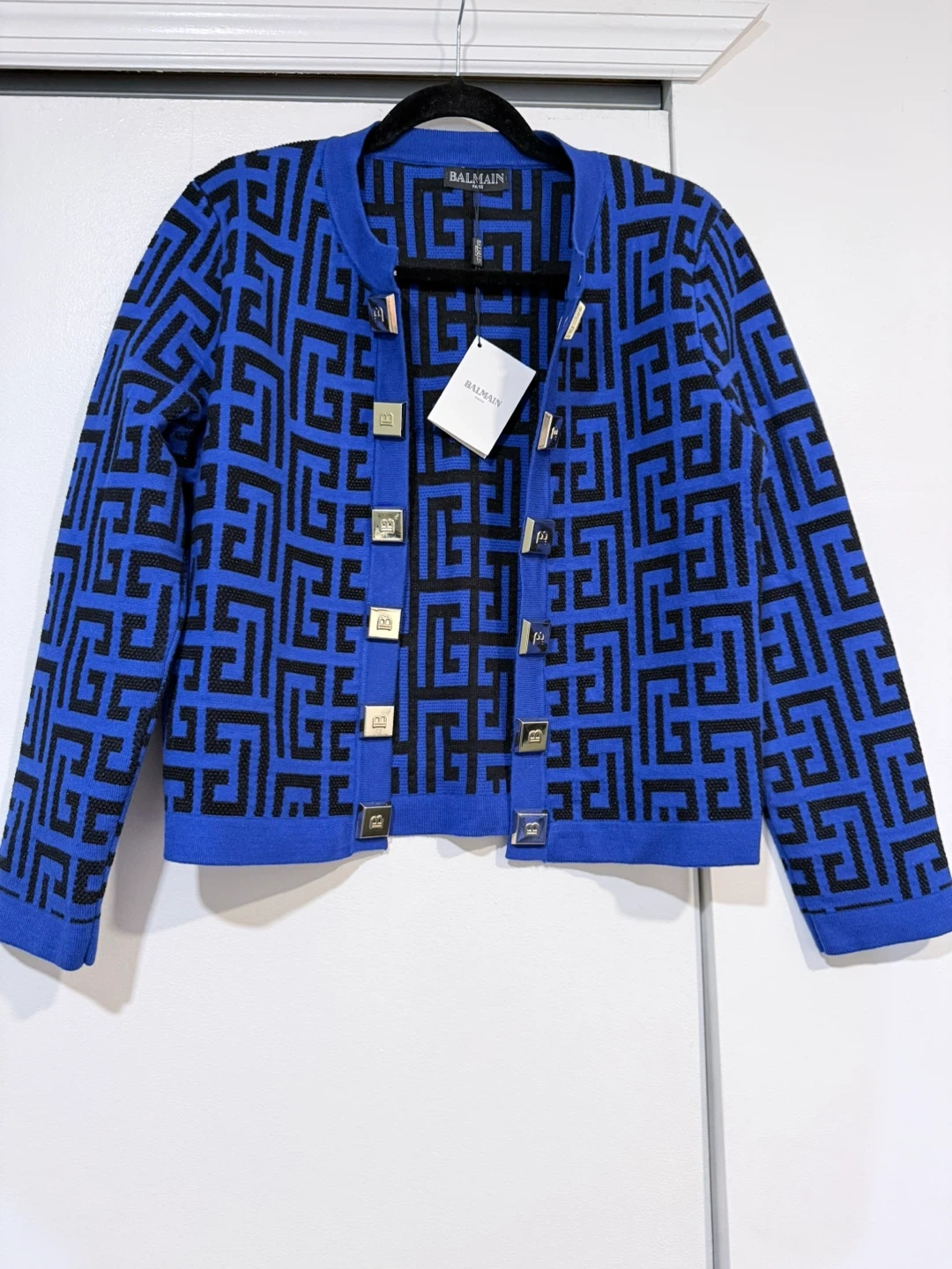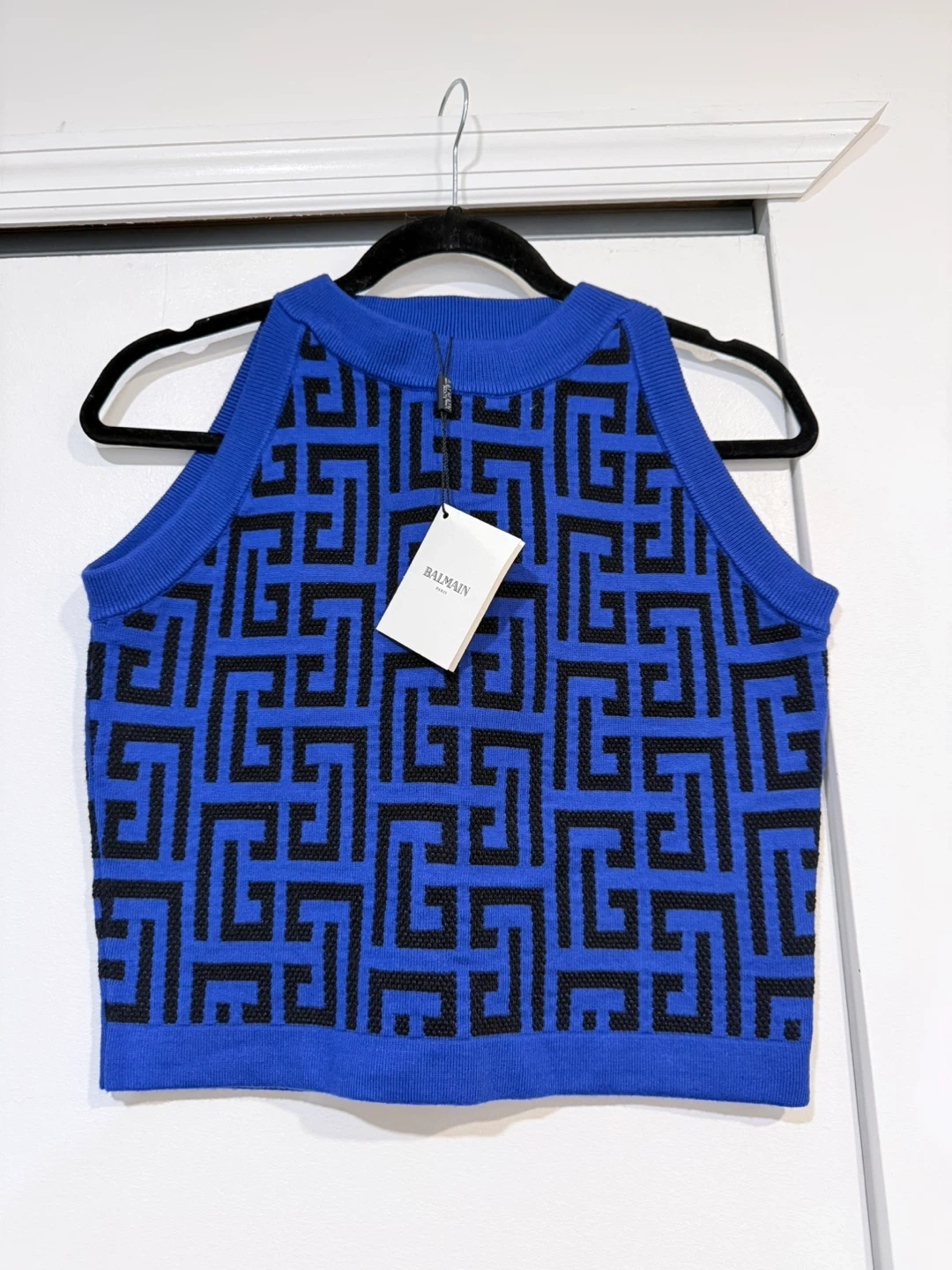 Selling a stylish Balmain knit set in a striking blue and black geometric pattern! The set includes a cardigan, a sleeveless top, and a skirt. Perfect for making a statement. Size LARGE