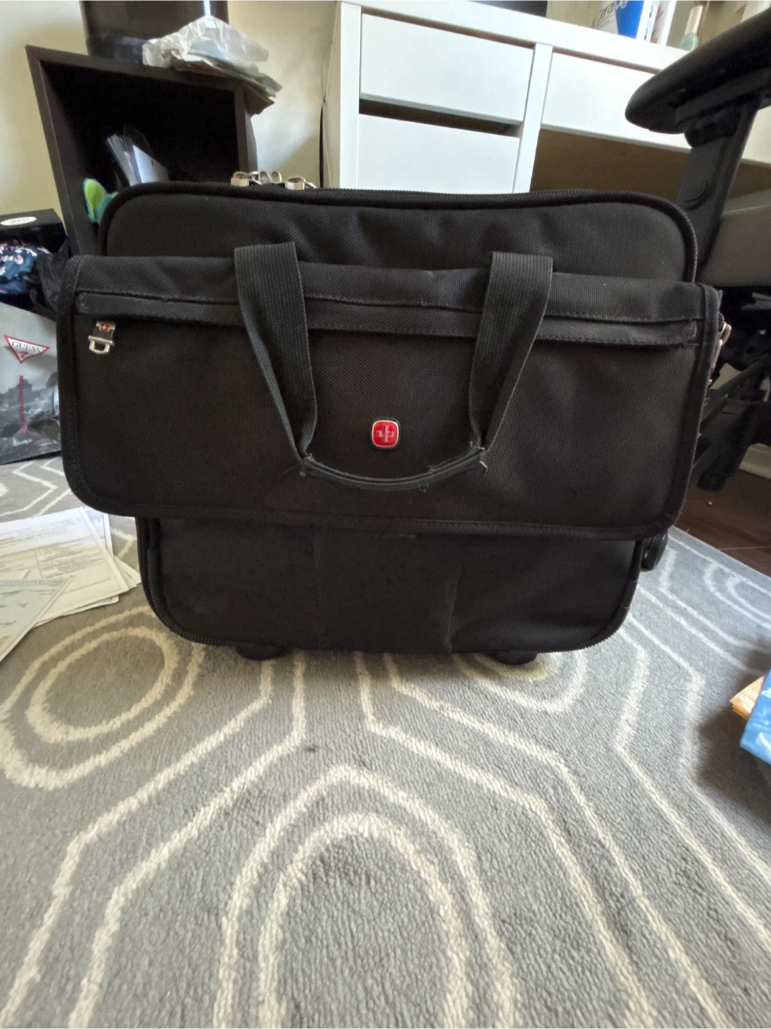 This is a black rolling briefcase from Swiss Gear. It's made of durable fabric and features wheels and a handle for easy transport. It's great for carrying work essentials or for travel!