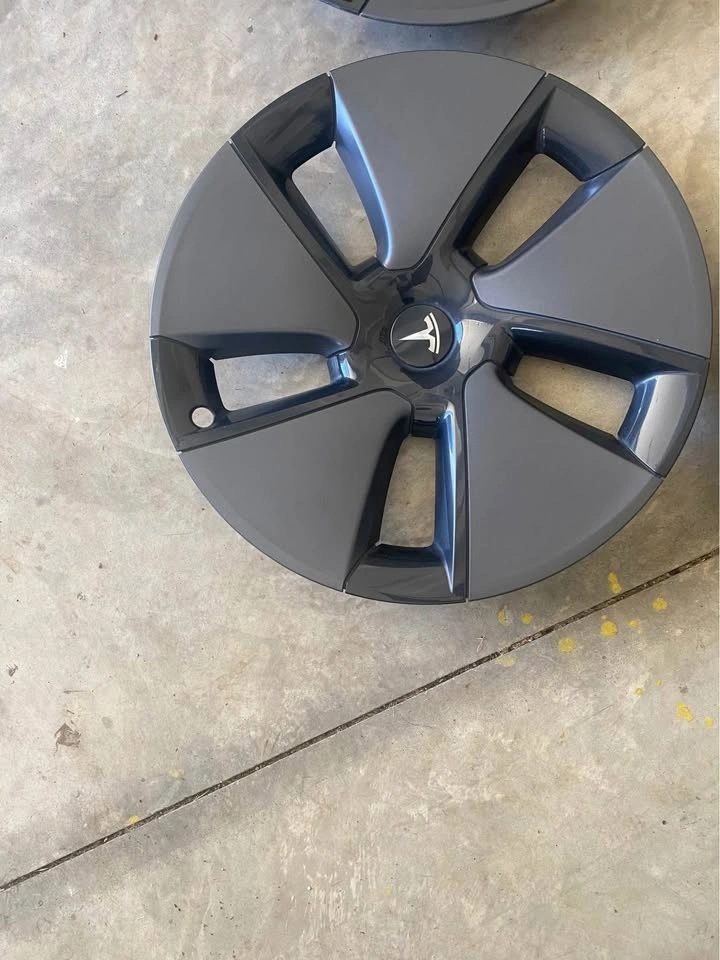Set of 4 Tesla wheel covers for 18" tires. Shows normal wear and tear as pictured. One cover has been repaired, as shown in the last picture. Located in Chilliwack.