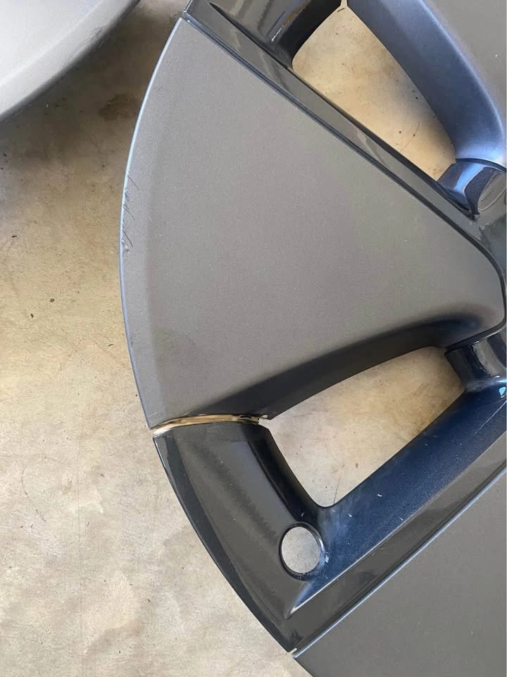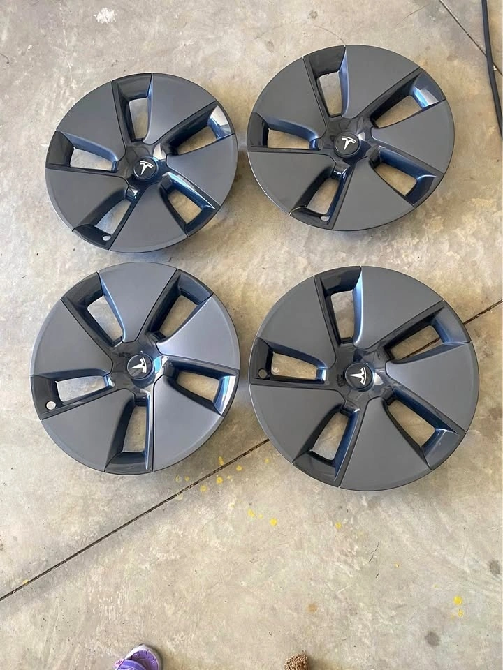 Set of 4 Tesla wheel covers for 18" tires. Shows normal wear and tear as pictured. One cover has been repaired, as shown in the last picture. Located in Chilliwack.