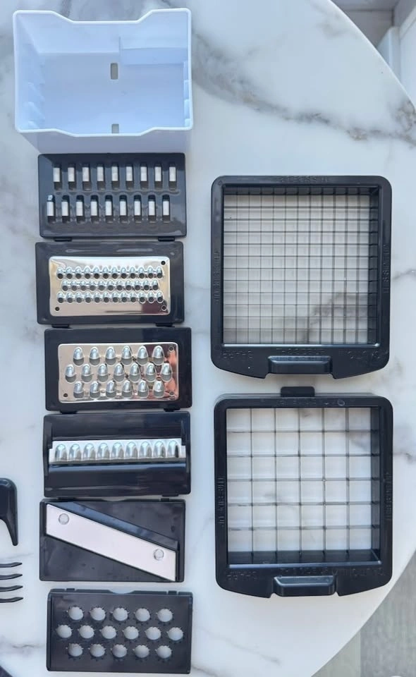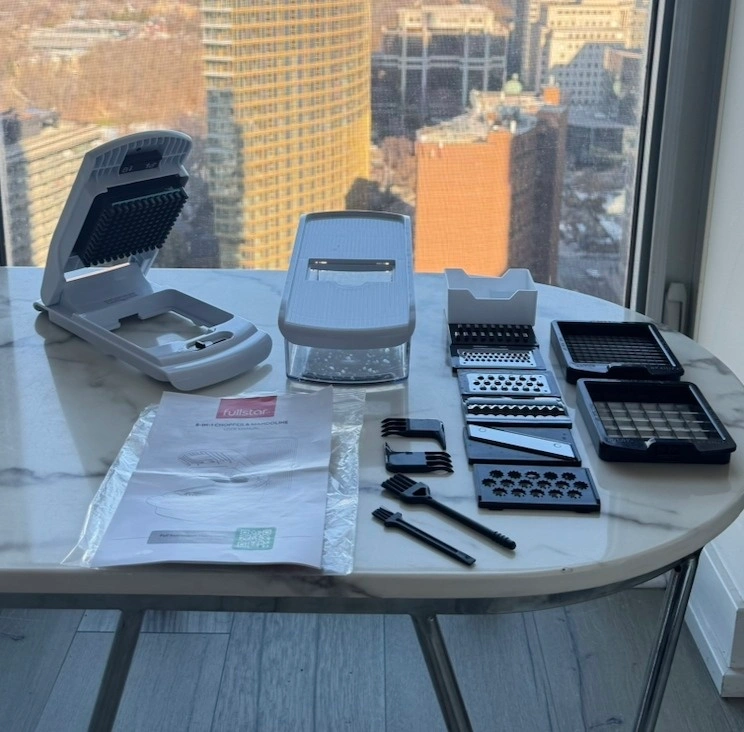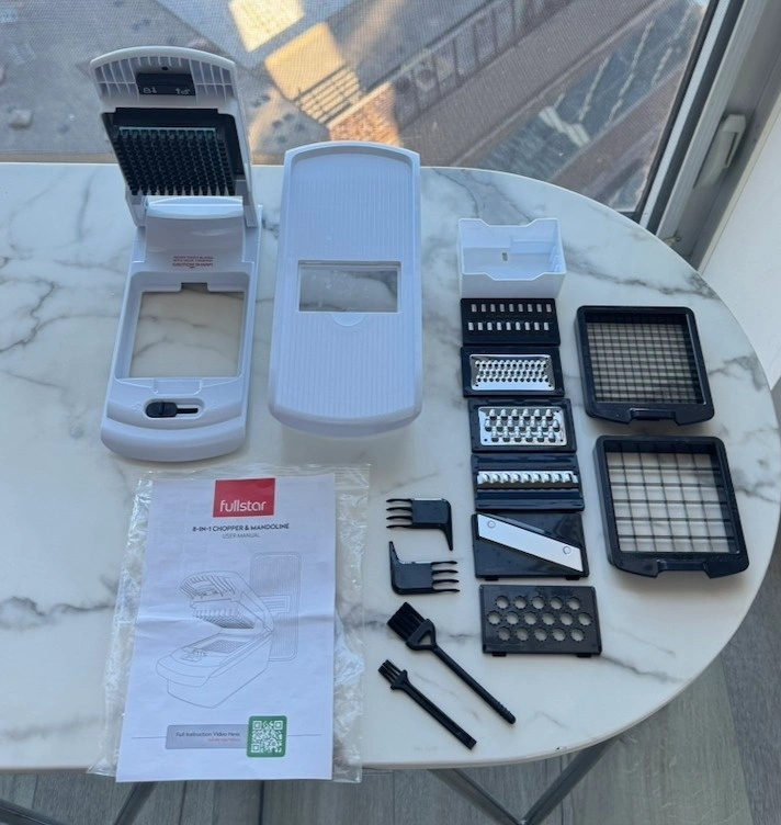 Fullstar 8-in-1 Vegetable Chopper & Mandoline Slicer in excellent condition. Purchased in October 2025 and lightly used. Selling due to moving. This popular kitchen gadget makes meal prep fast and easy — perfect for chopping vegetables, salads, and meal prep in seconds. Features: 8-in-1 chopper, slicer, dicer, and grater, Razor-sharp stainless steel blades, Large 5-cup container for catching chopped vegetables, Non-slip base for stability, Soft-grip handle for better control, Dishwasher safe, BPA-free.