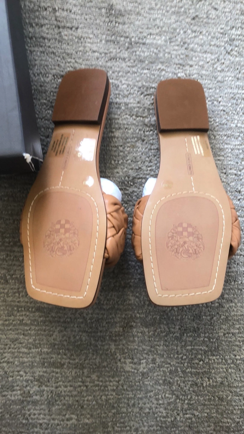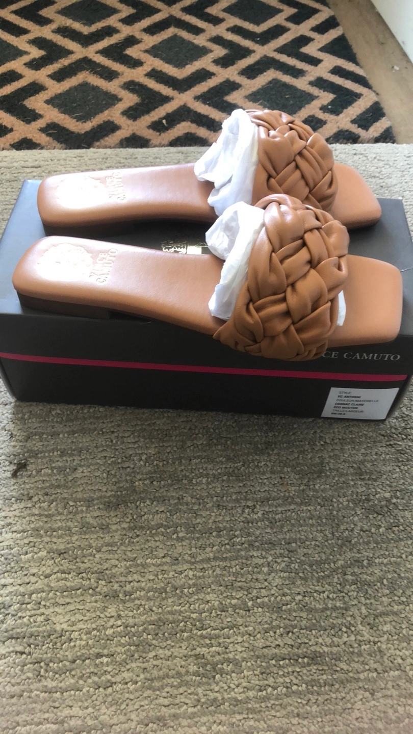 These Vince Camuto Antonni sandals are in excellent condition and come with the box! They are a size 8M and the colour is light cognac. The material is eco sheep, making them a stylish and environmentally conscious choice for your wardrobe