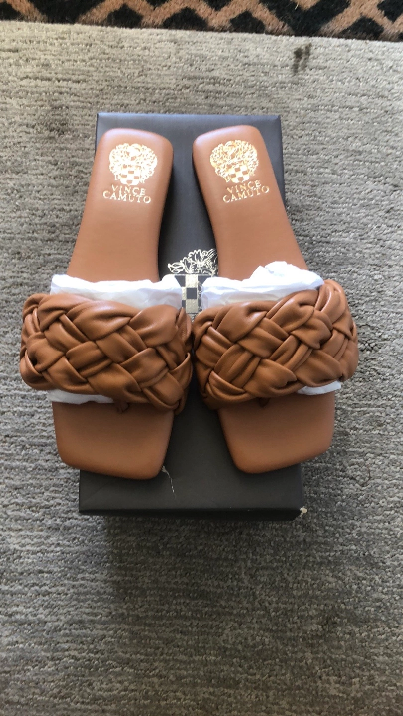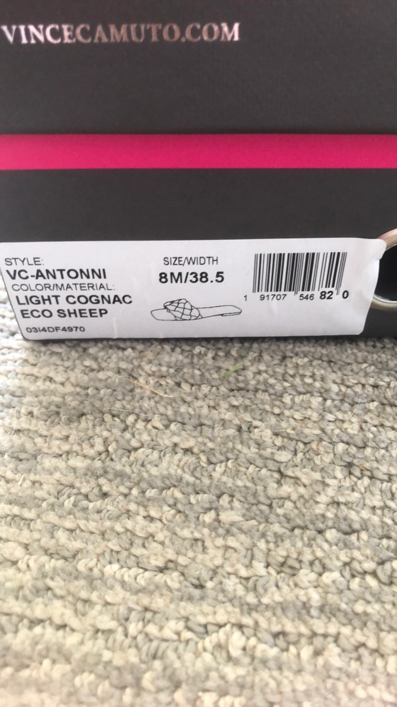 These Vince Camuto Antonni sandals are in excellent condition and come with the box! They are a size 8M and the colour is light cognac. The material is eco sheep, making them a stylish and environmentally conscious choice for your wardrobe