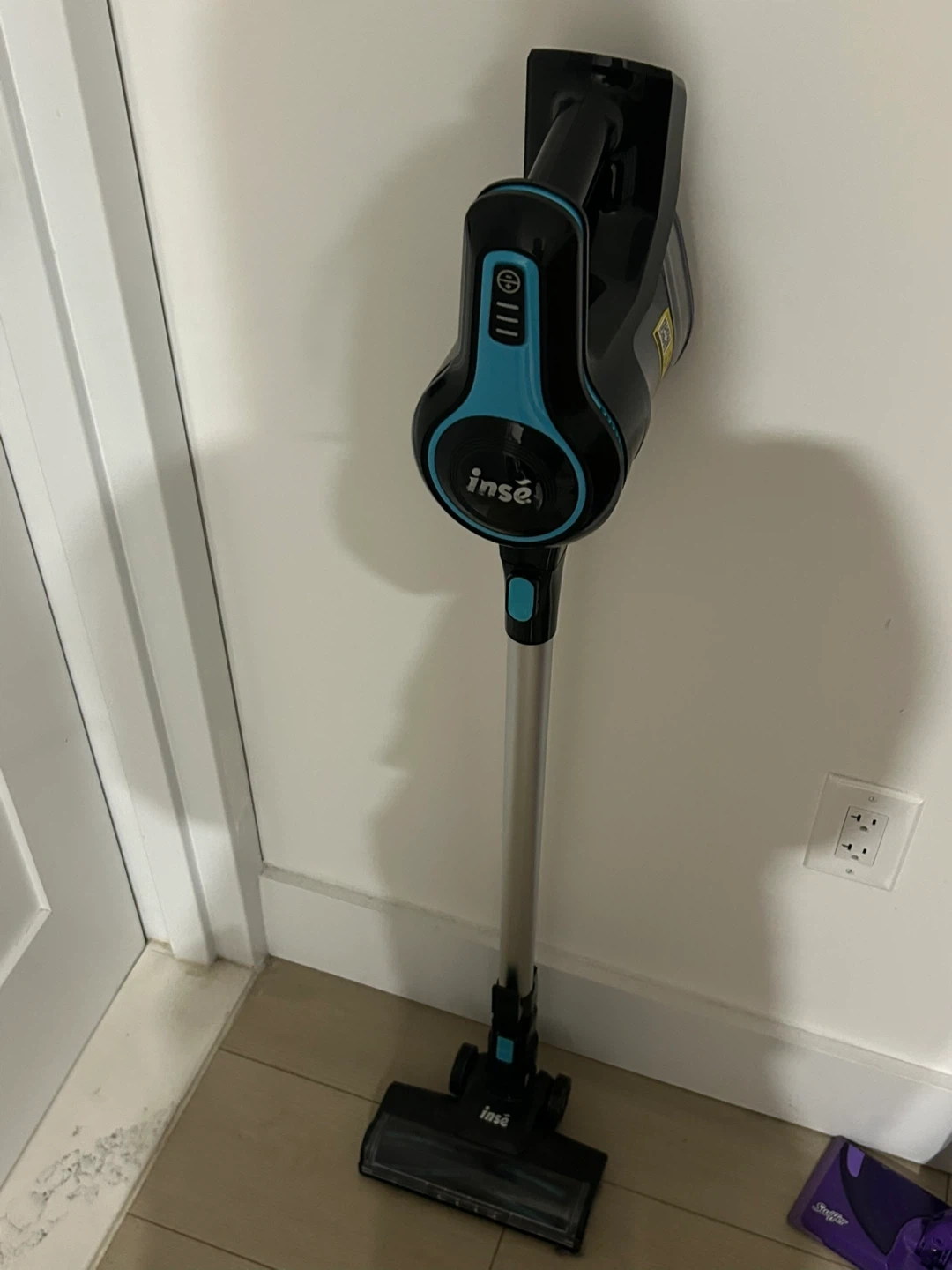 This INSE cordless stick vacuum is black and blue. It's lightweight and easy to maneuver. It's suitable for everyday cleaning tasks. Comes with 3 attachments