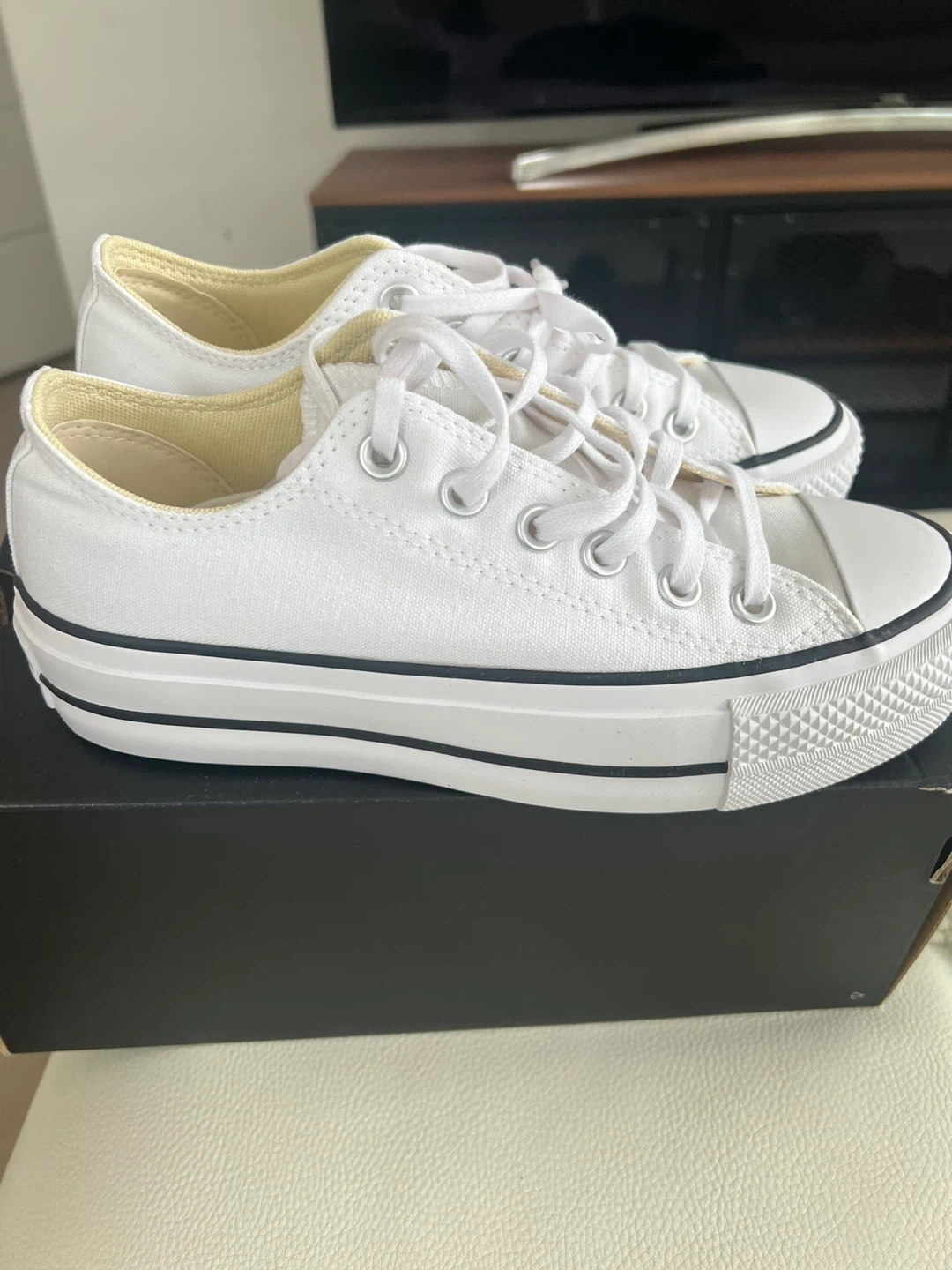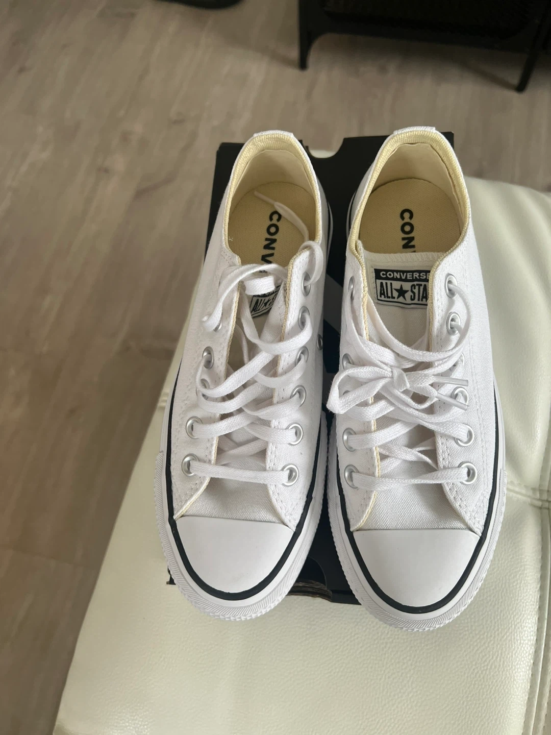 These Converse All Star low sneakers are brand new and ready for a new home! They are a classic white colour, perfect for any outfit. They come with the original box