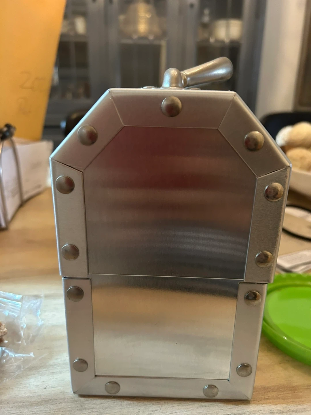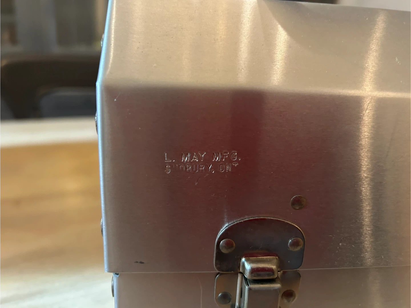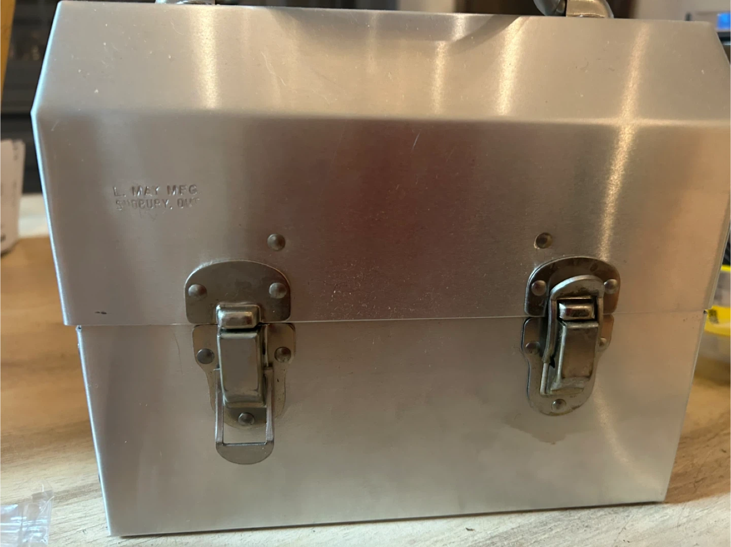 This is a handmade metal lunch box from The Miners Lunchbox Fabricators in Sudbury, Ontario. It's made of aluminum and has a classic design with two clasps. Perfect for carrying your lunch!