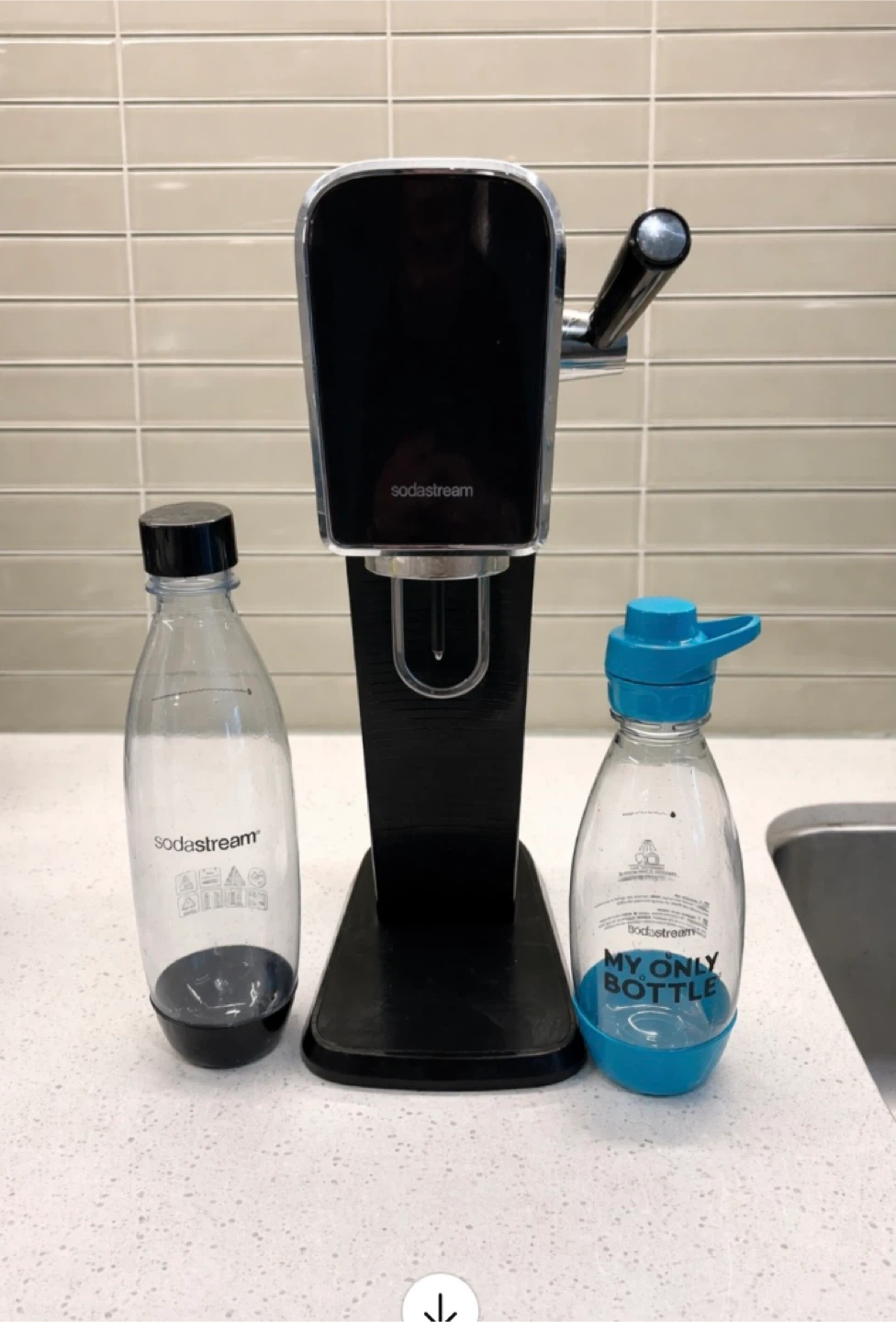 SodaStream sparkling water maker in black. It comes with two reusable bottles.