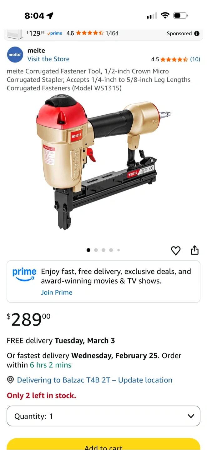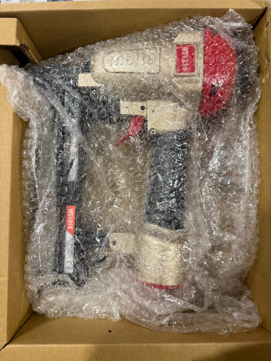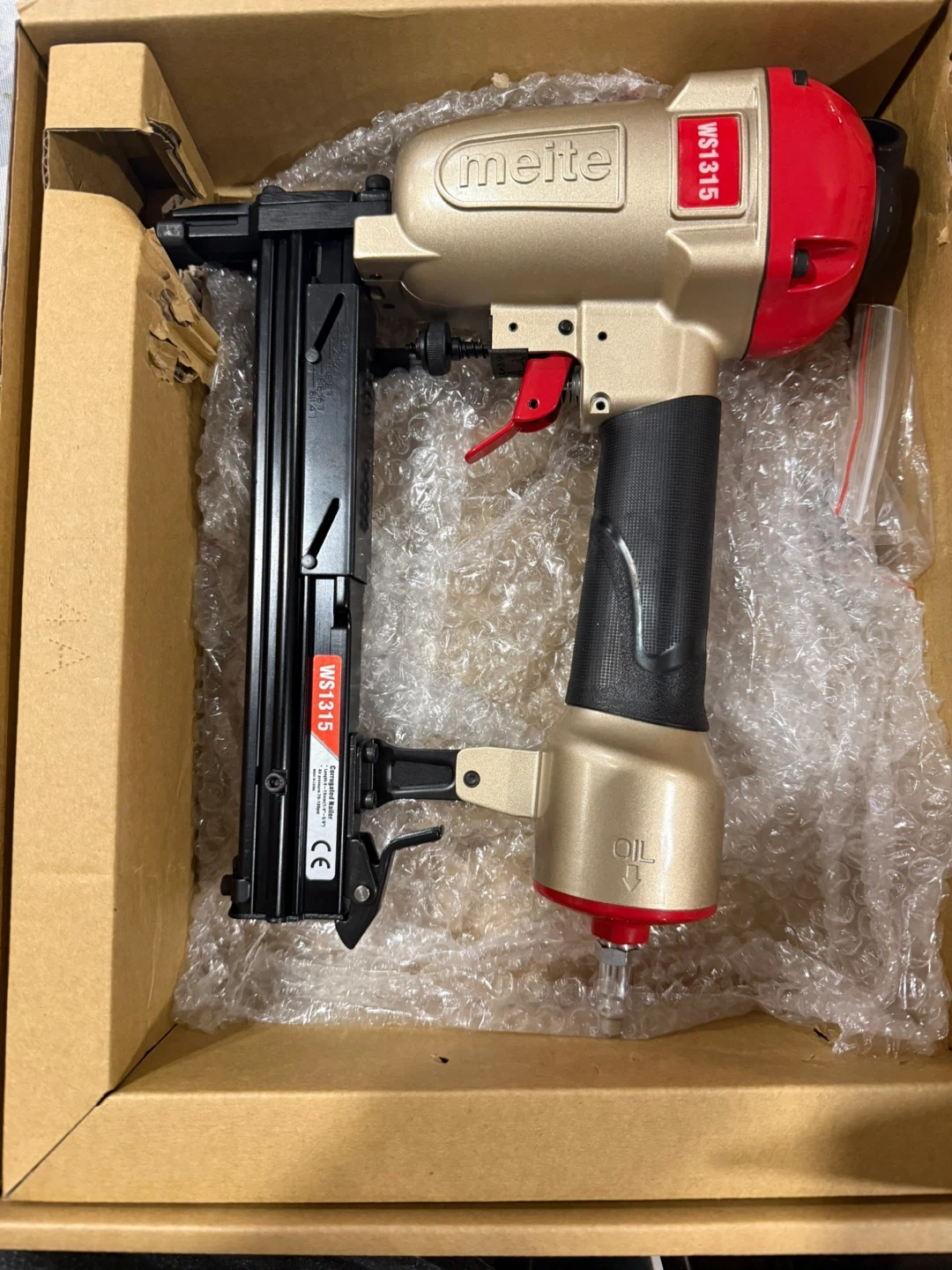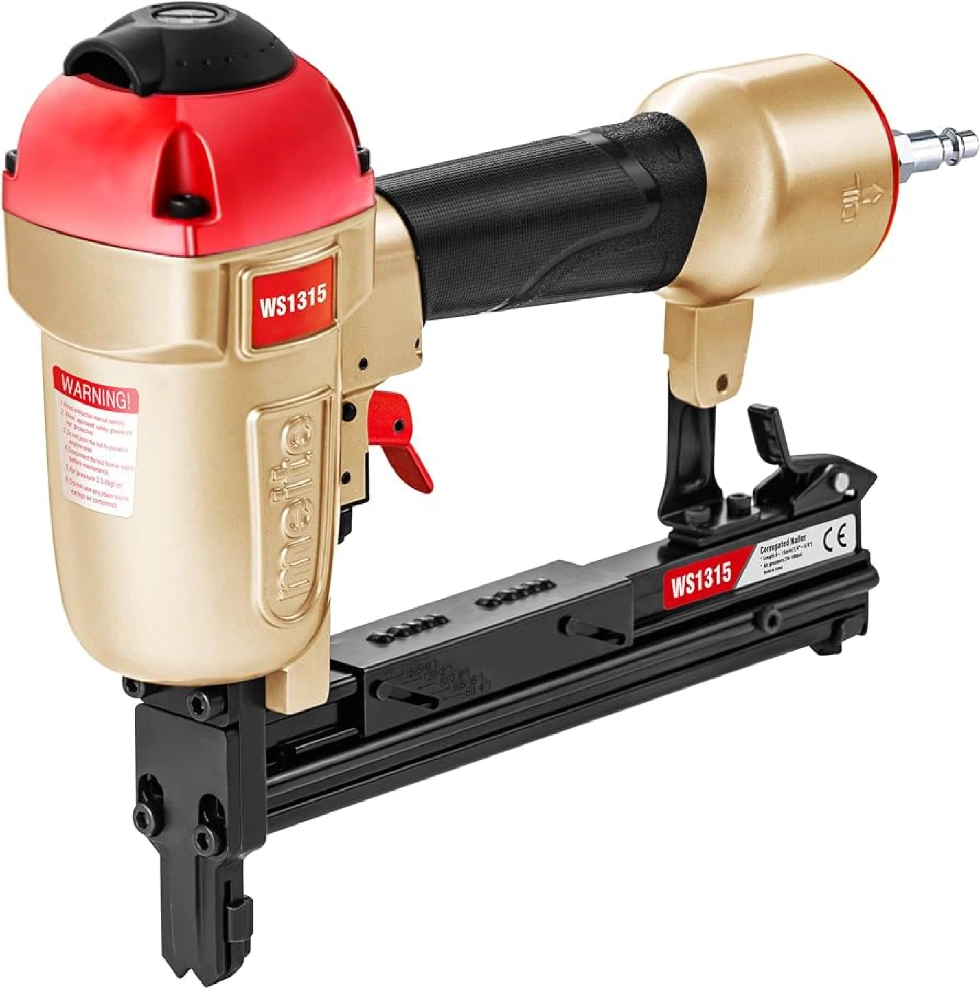 This Meite WS1315 is a pneumatic corrugated fastener tool. It accepts 1/4-inch to 5/8-inch leg lengths. Magazine capacity is 156 pcs.