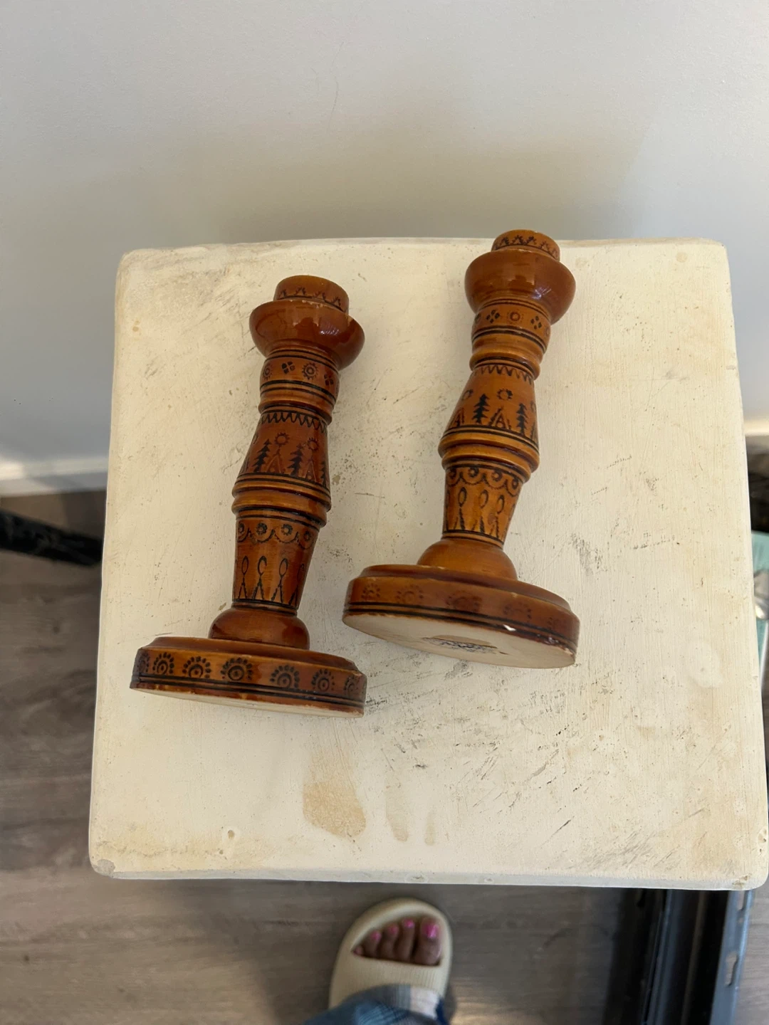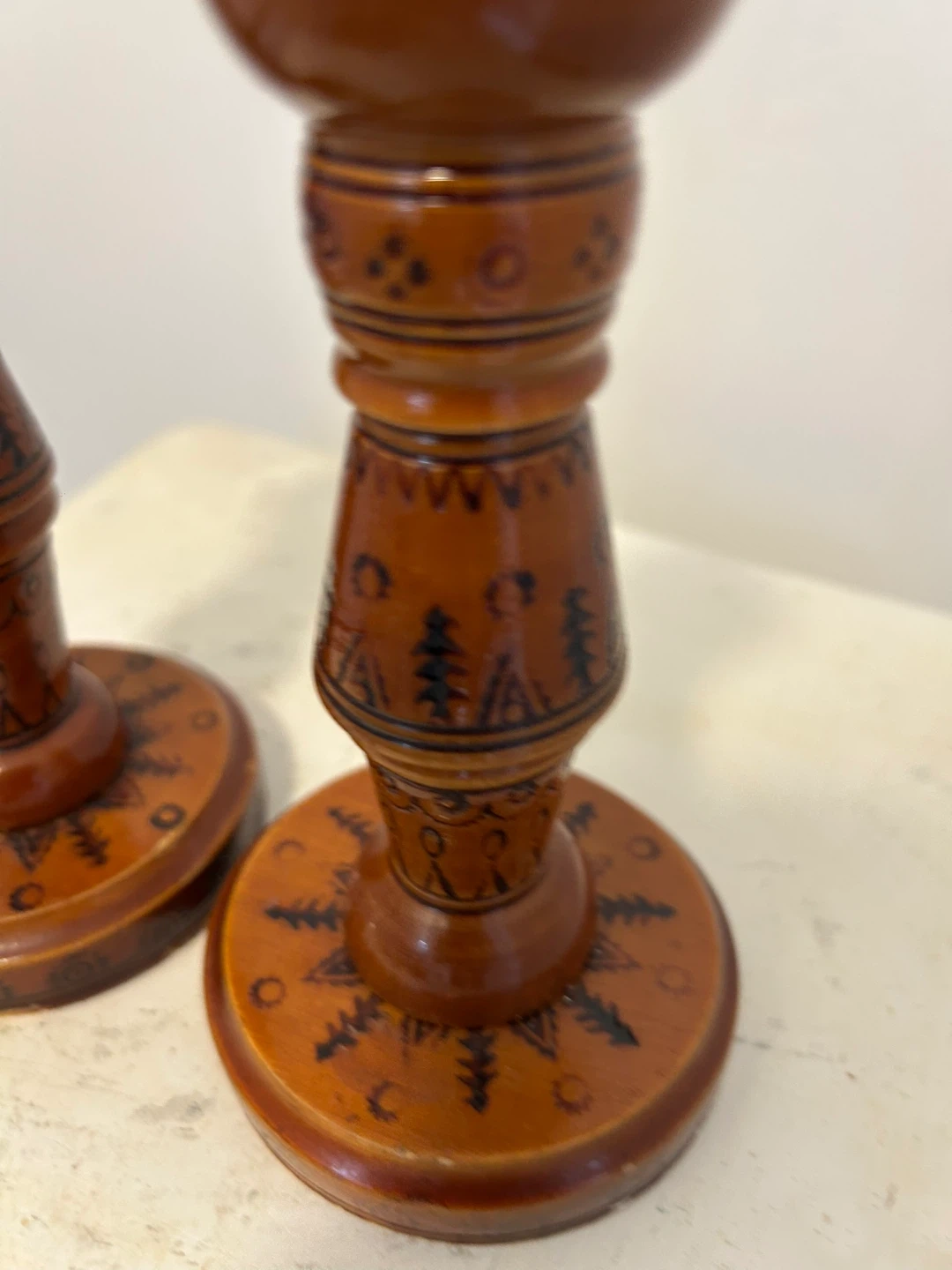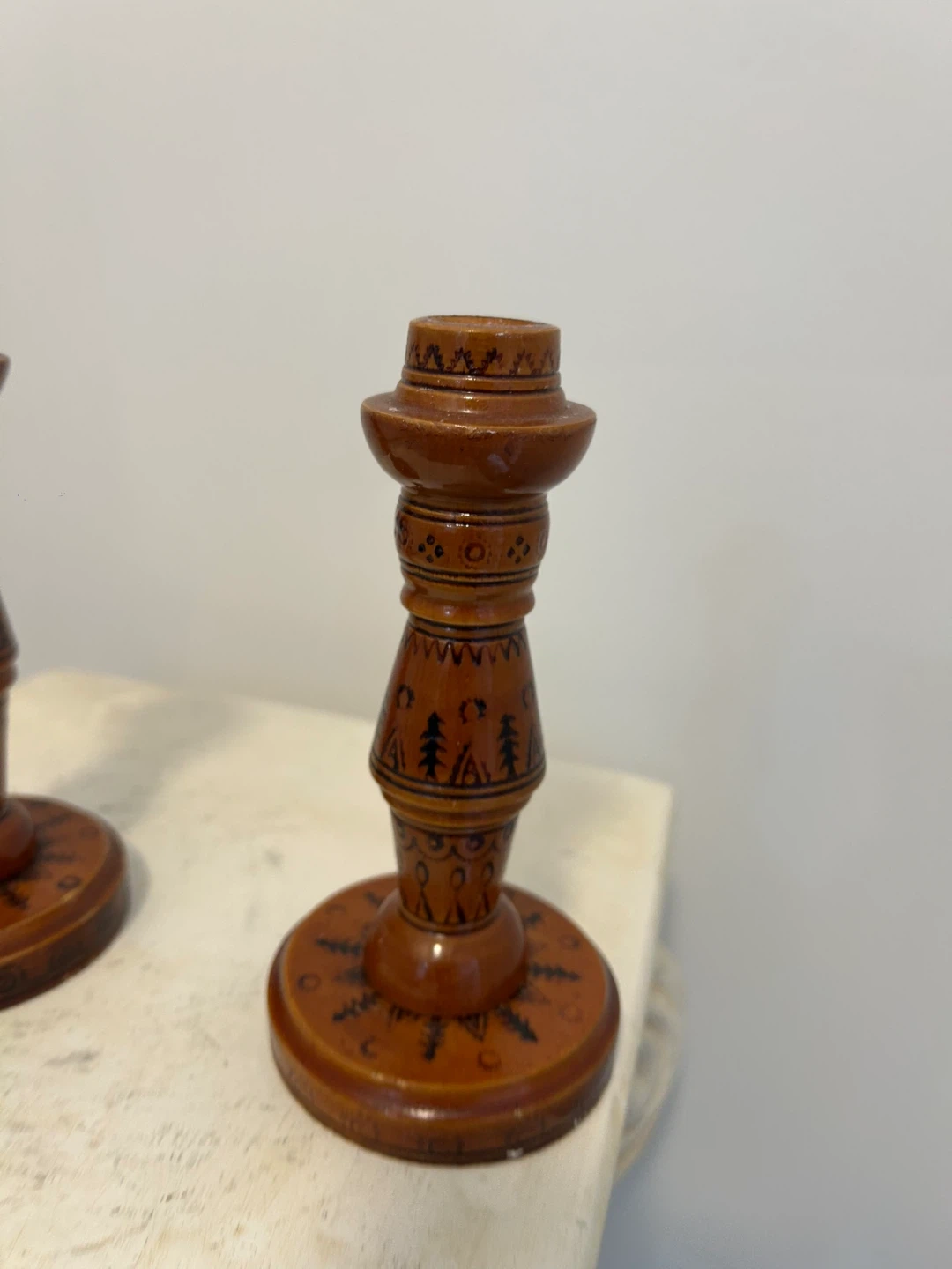 A pair of charming wooden candlesticks featuring hand-painted folk art designs. Each candlestick is finished in a warm brown tone. Perfect for adding a rustic touch to your home decor!