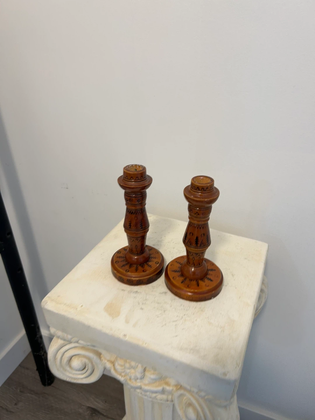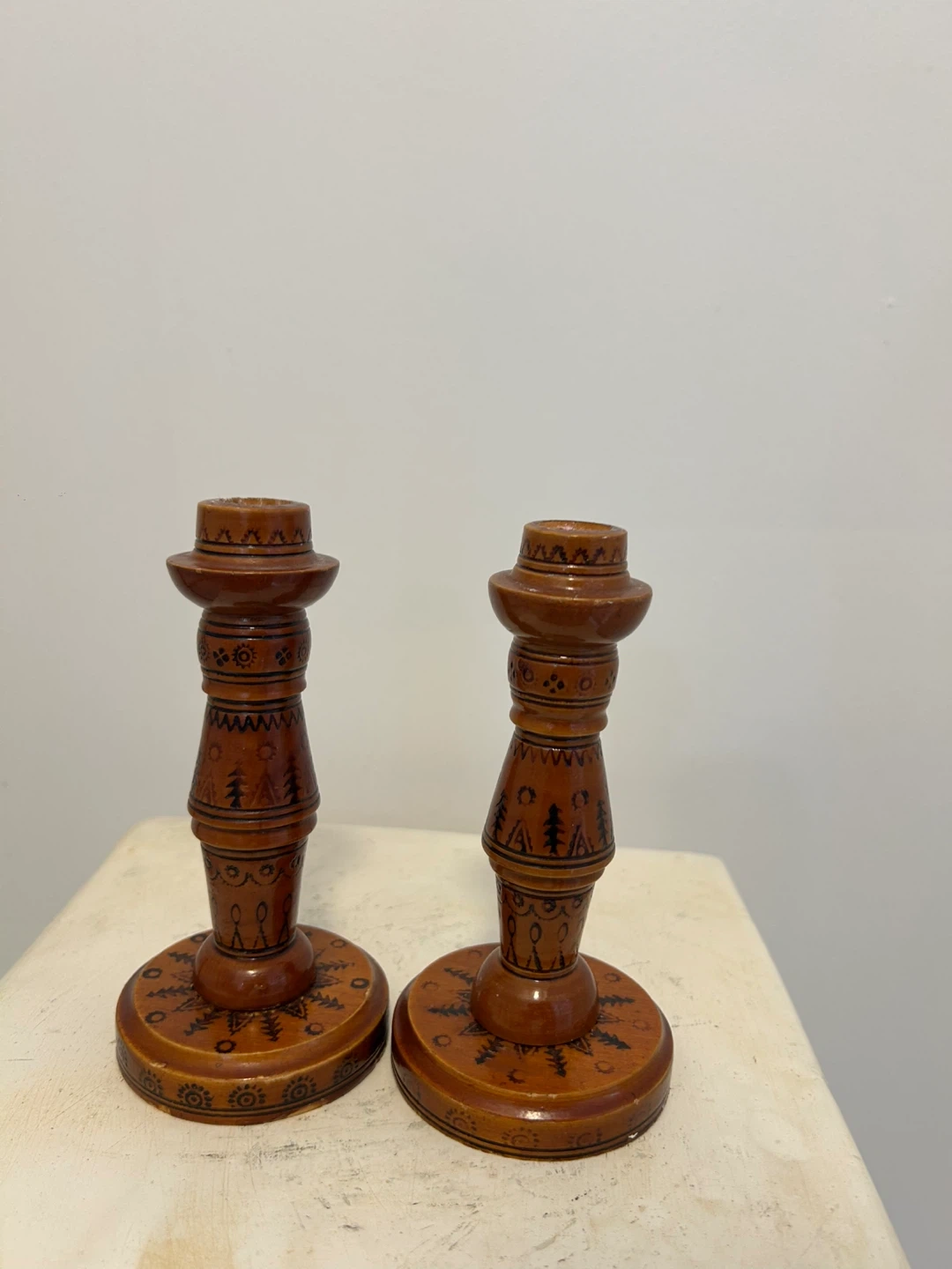 Set of 2 Wooden Candlesticks with Folk Art Design