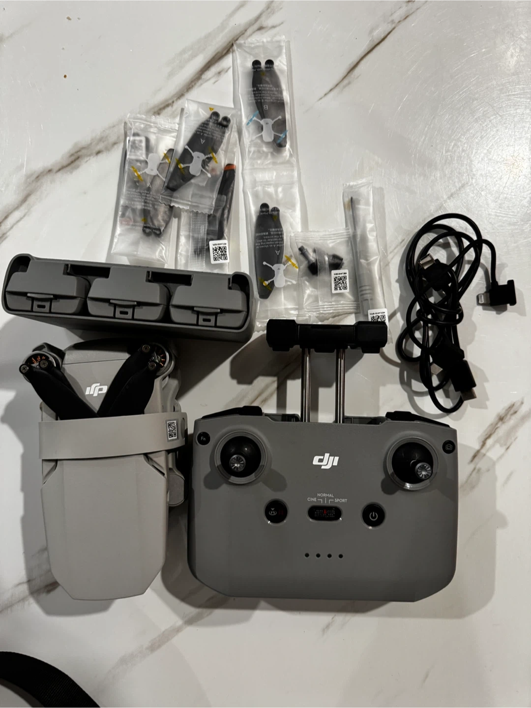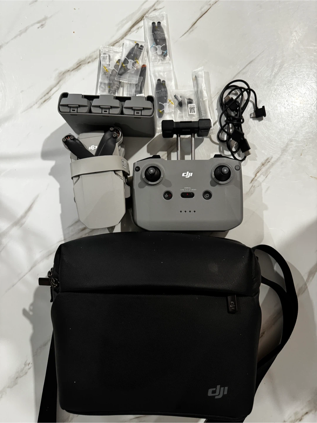 This DJI Mini 2 Fly More Combo includes the drone, remote controller, extra batteries, charging hub, spare propellers, and a carrying bag. All components are gray and black. It's ready for your next adventure!