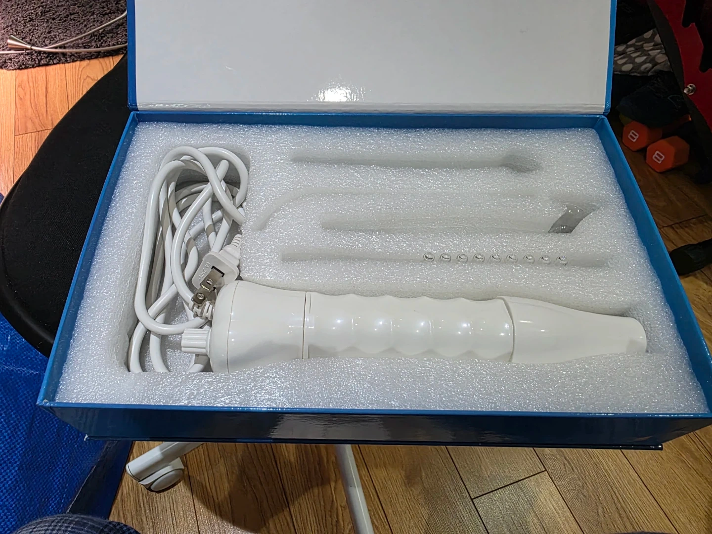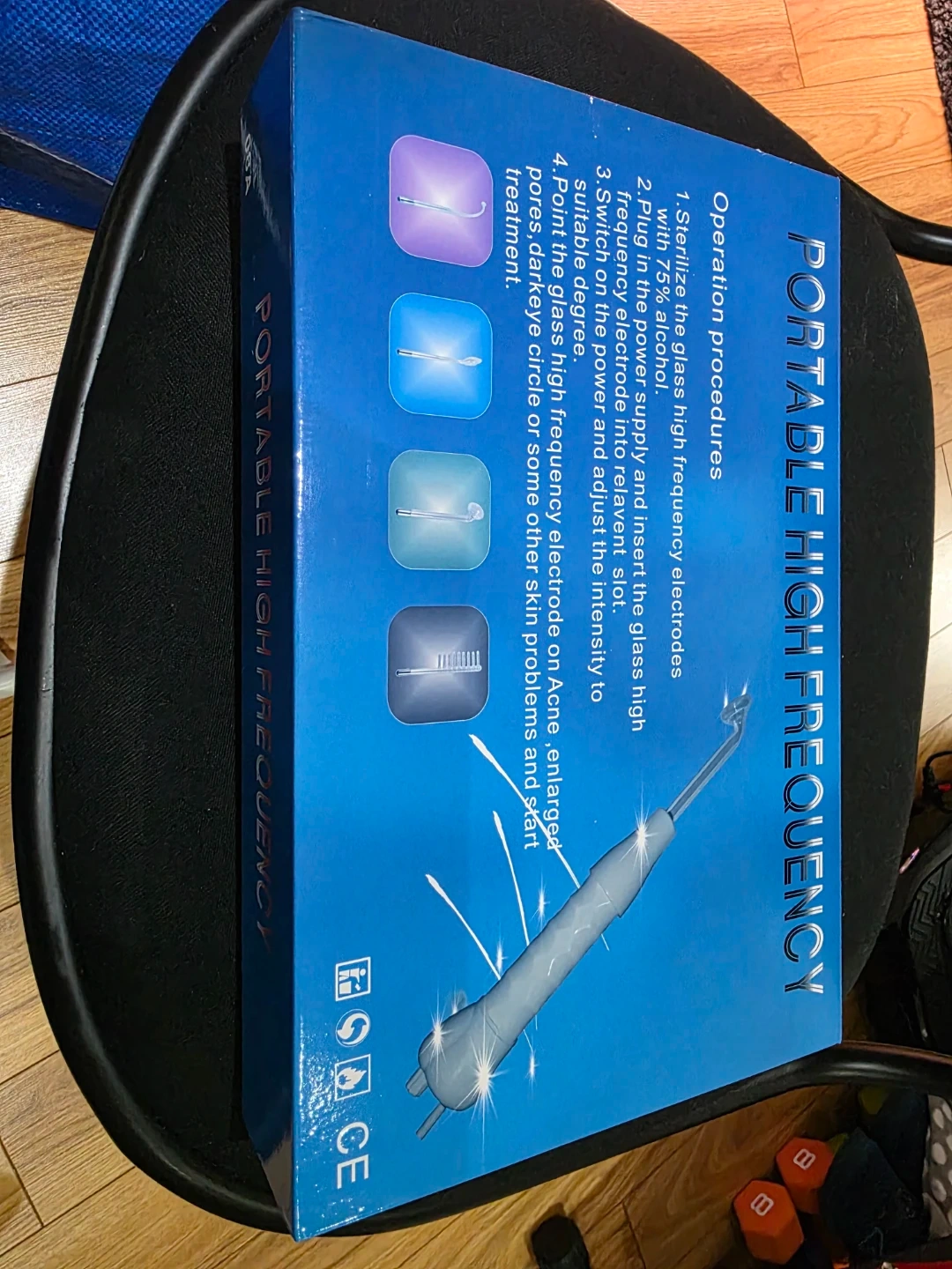 This portable high frequency facial wand comes with multiple electrodes for different skin treatments. It's designed to help with acne, enlarged pores, and other skin concerns. Includes original box and all accessories shown.