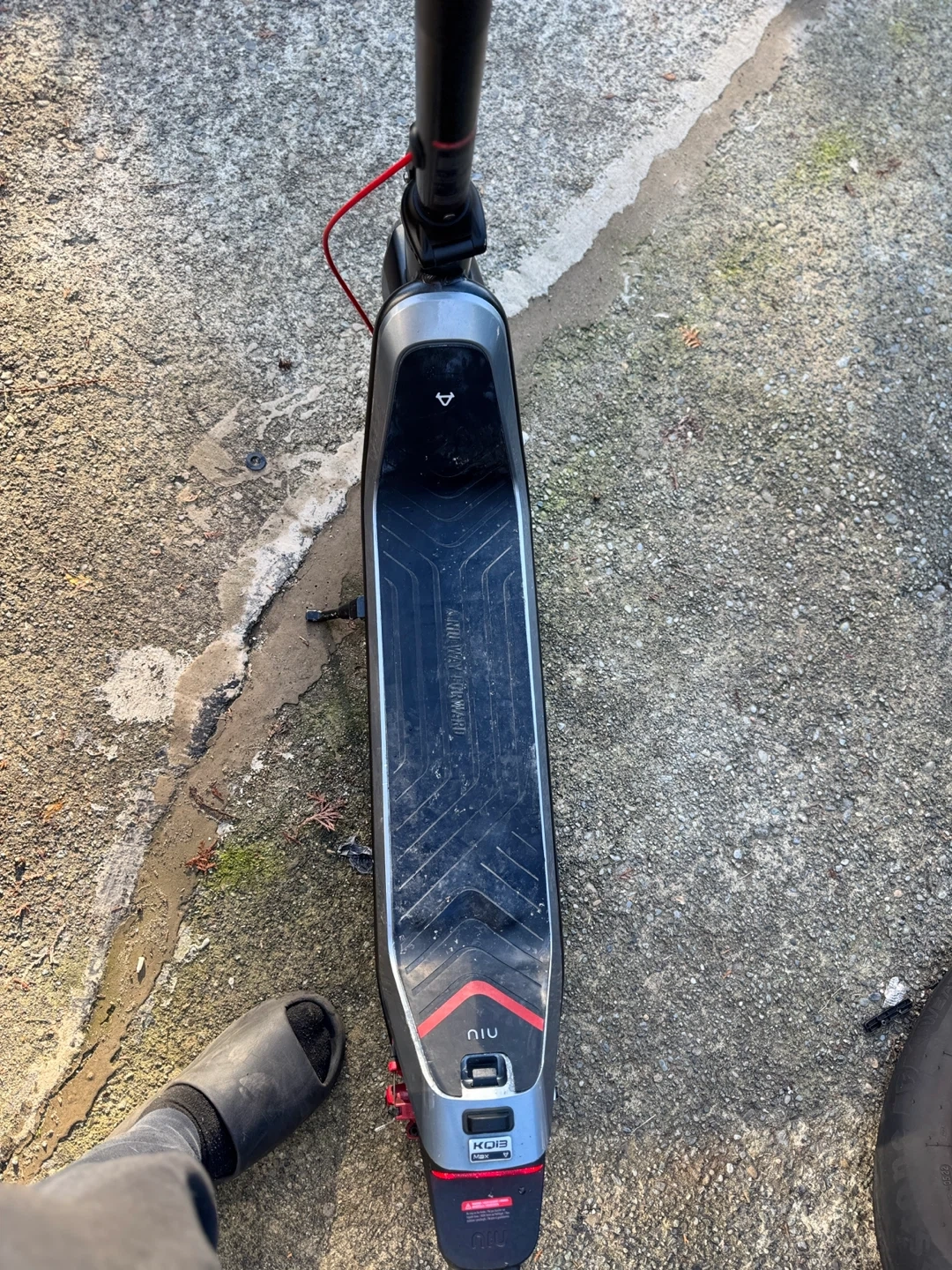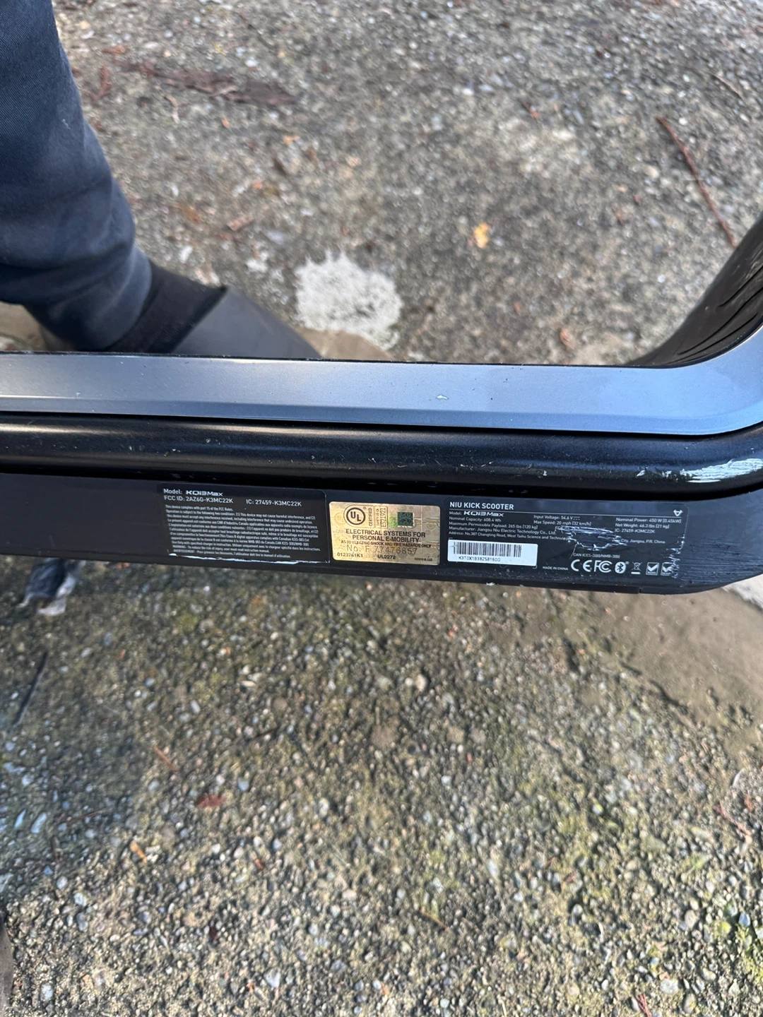 NIU KQi3 Max electric scooter in grey. It's a great way to get around town. Features a deck with grip tape and a rear brake light.