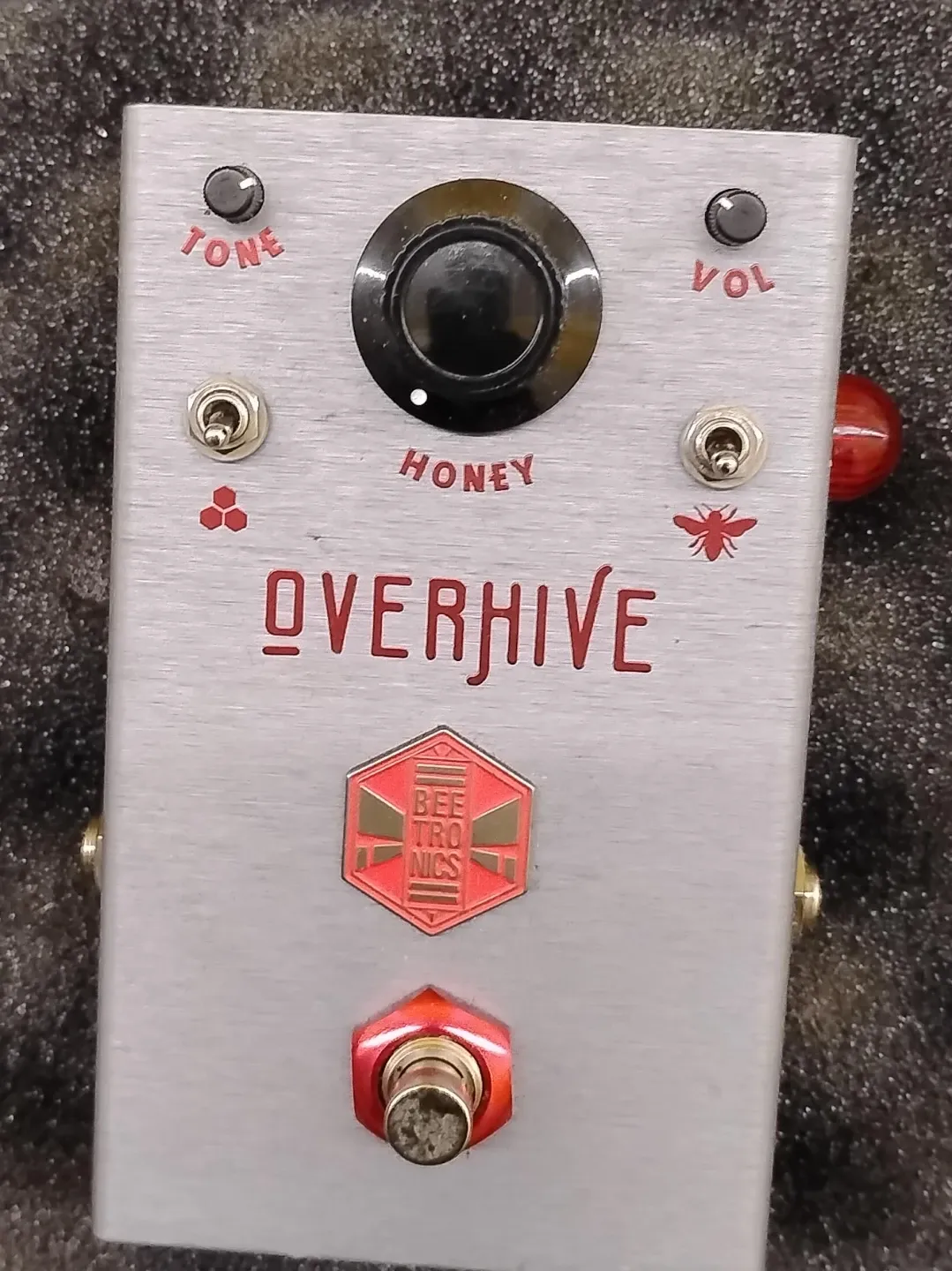 This is the Beetronics Overhive Honey overdrive pedal. It's a versatile overdrive with tone and volume controls. This pedal provides a warm, rich sound perfect for guitarists seeking a classic overdrive tone.