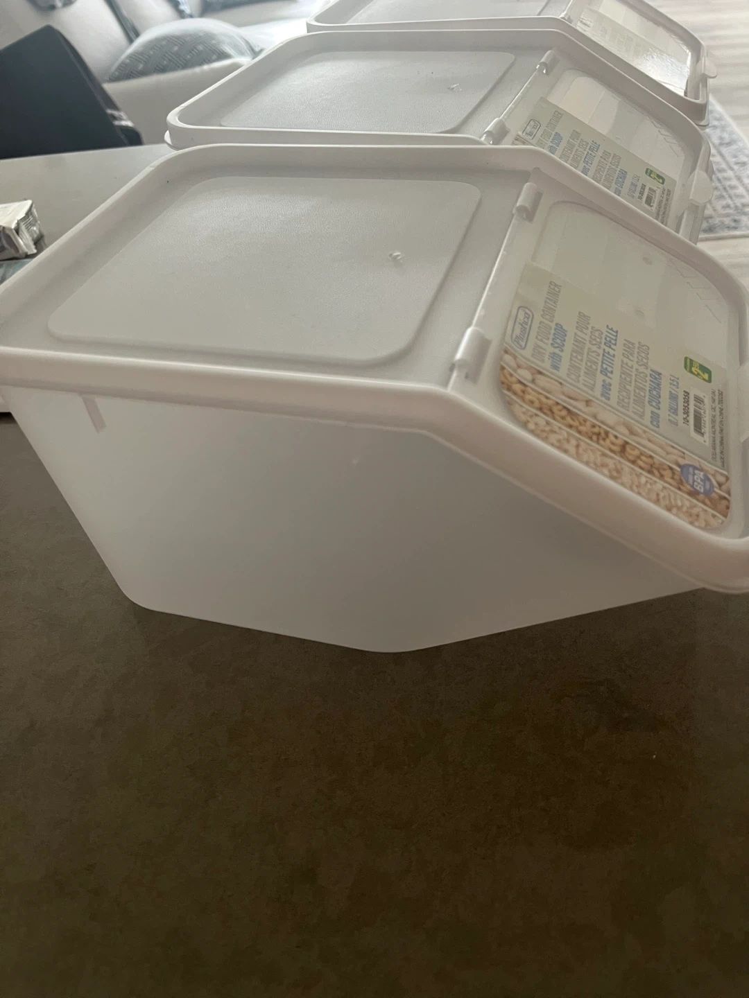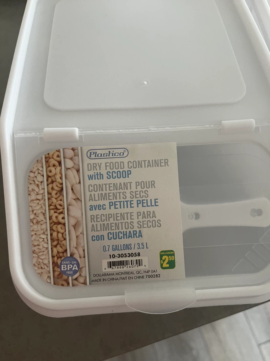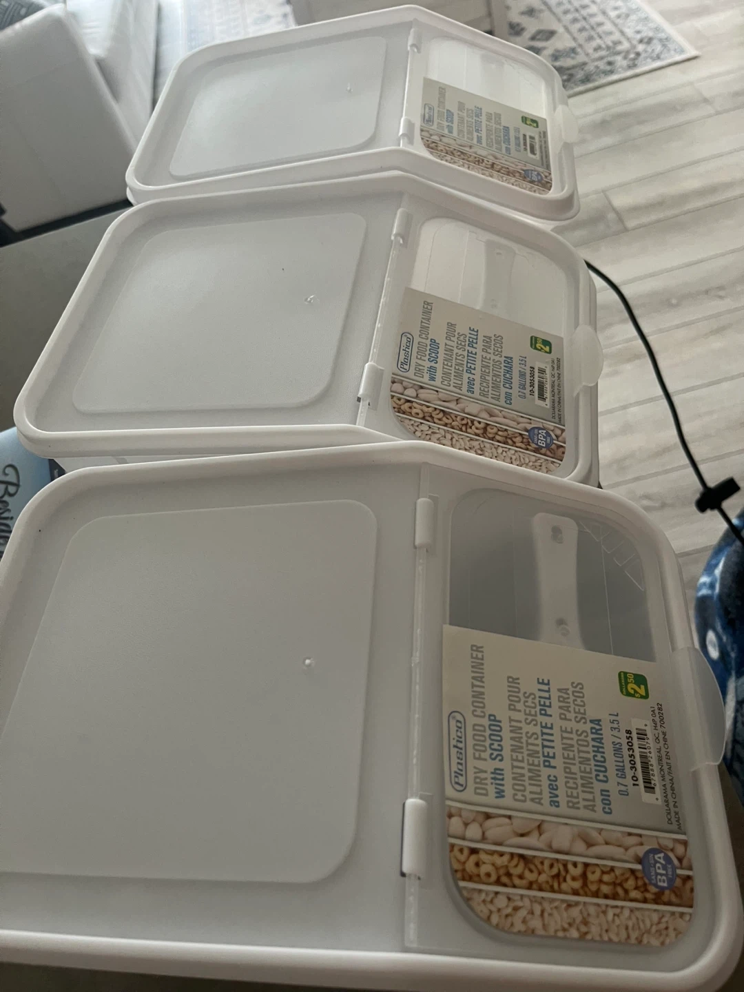 Selling Plastica dry food container, perfect for keeping your pantry organized! It comes with a handy scoop and has a capacity of 3.5L (0.7 gallons). Originally from Dollarama for $2.50, these containers are BPA-free and great for storing dry goods. Brand new, never used. Take all three for $6.00.