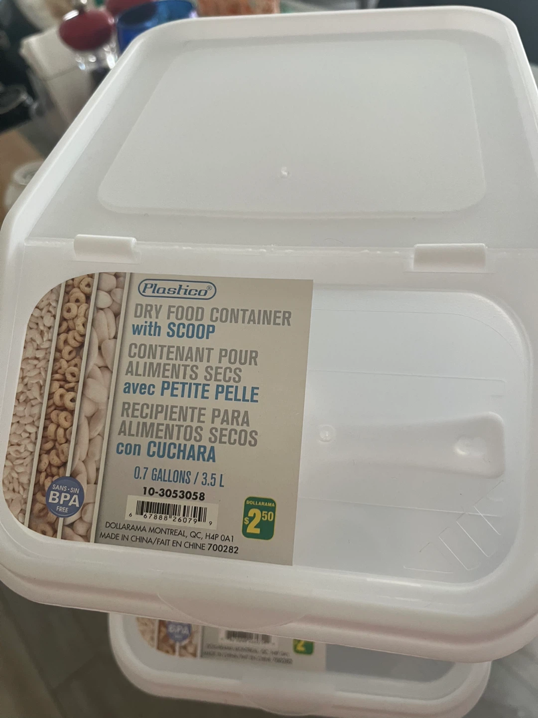 Selling Plastica dry food container, perfect for keeping your pantry organized! It comes with a handy scoop and has a capacity of 3.5L (0.7 gallons). Originally from Dollarama for $2.50, these containers are BPA-free and great for storing dry goods. Brand new, never used. Take all three for $6.00.