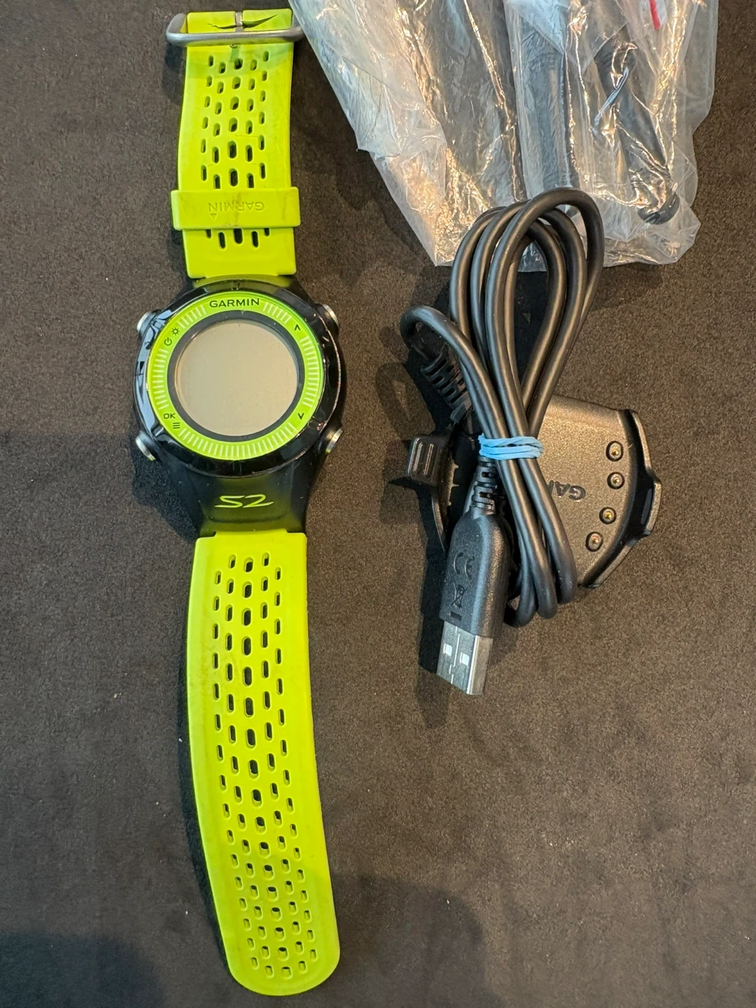 Garmin Approach S2 golf GPS watch. It's black with a bright green band and an extra green band is included. Comes with charger and original box.
