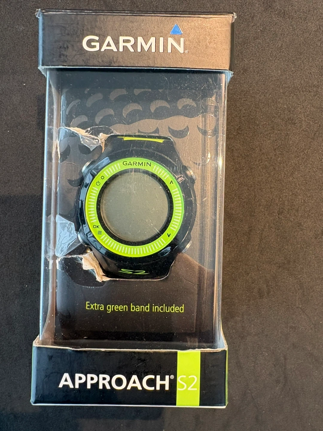Garmin Approach S2 golf GPS watch. It's black with a bright green band and an extra green band is included. Comes with charger and original box.