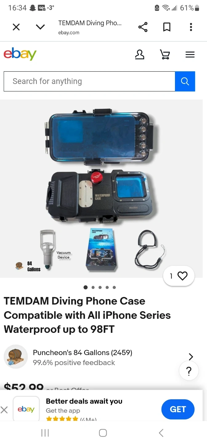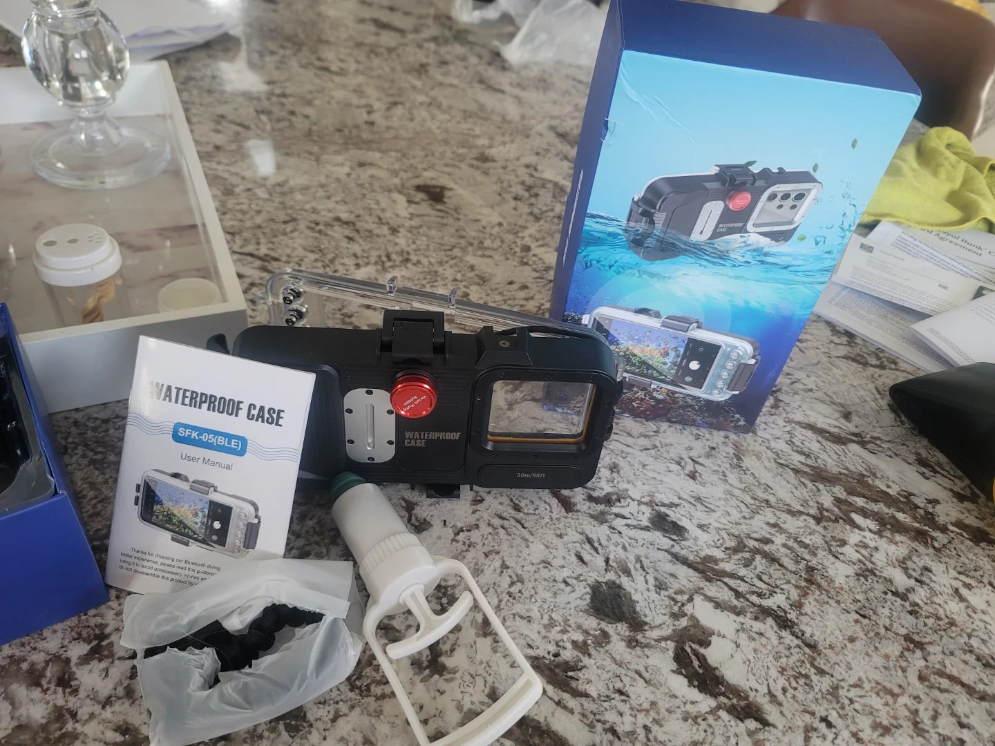 TEMDAM diving phone case, model SFK-08(BLE). It's compatible with all iPhone series and waterproof up to 98 feet. Includes vacuum device and wrist strap.
