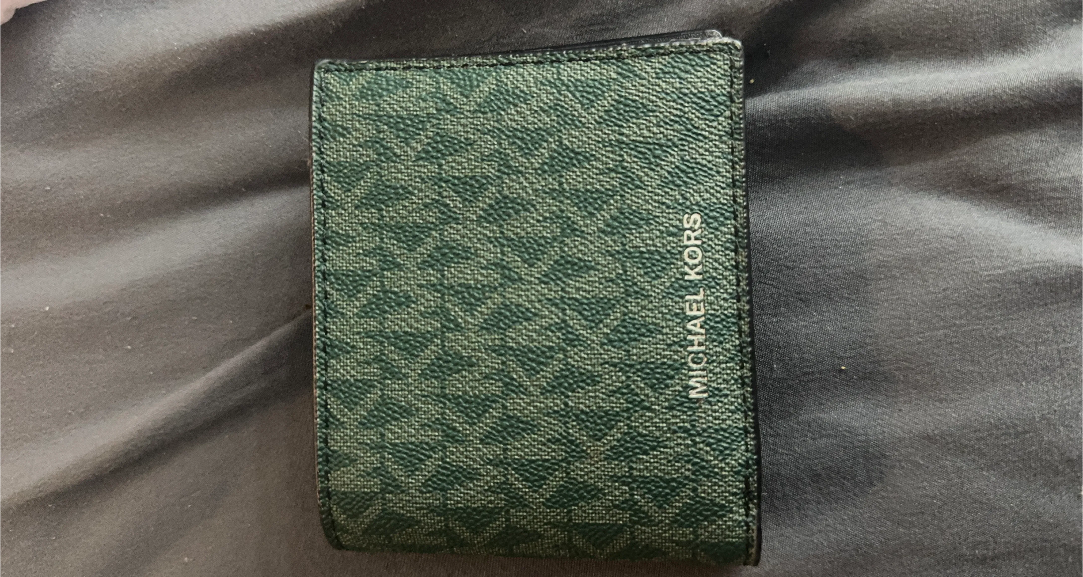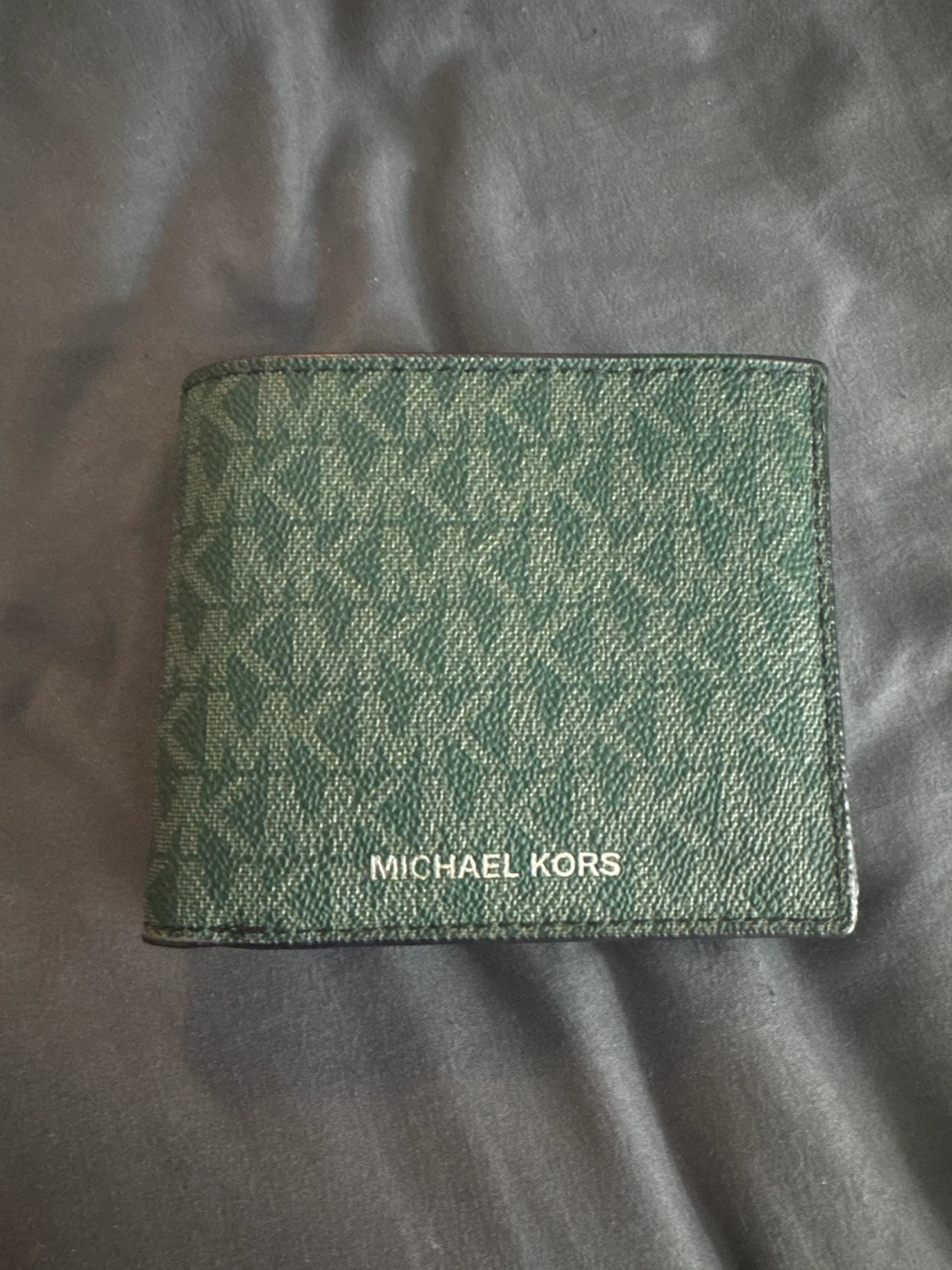 A green Michael Kors bi-fold wallet with the signature MK monogram pattern. It's a stylish accessory for carrying your cards and cash.