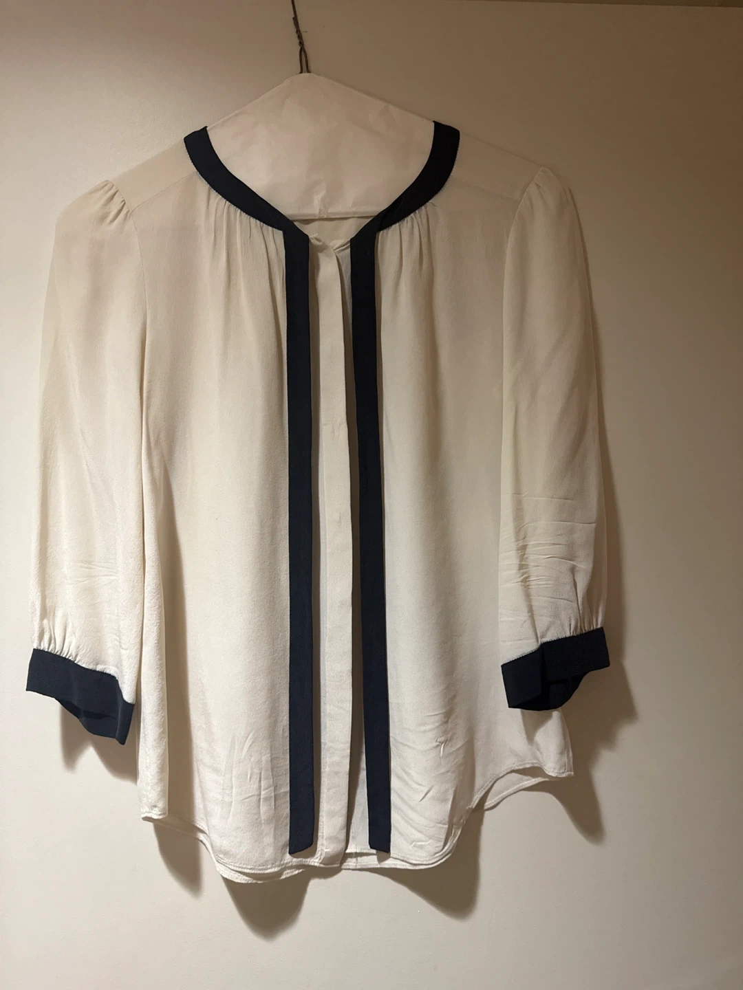 A beautiful t. babaton blouse made from 100% silk! The blouse is size small and features a lovely design with black accents which can be tied in a bow. It was dry cleaned last but it hand washes well too.