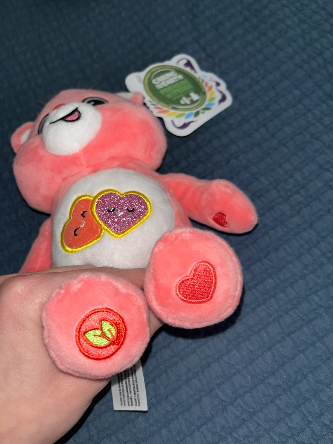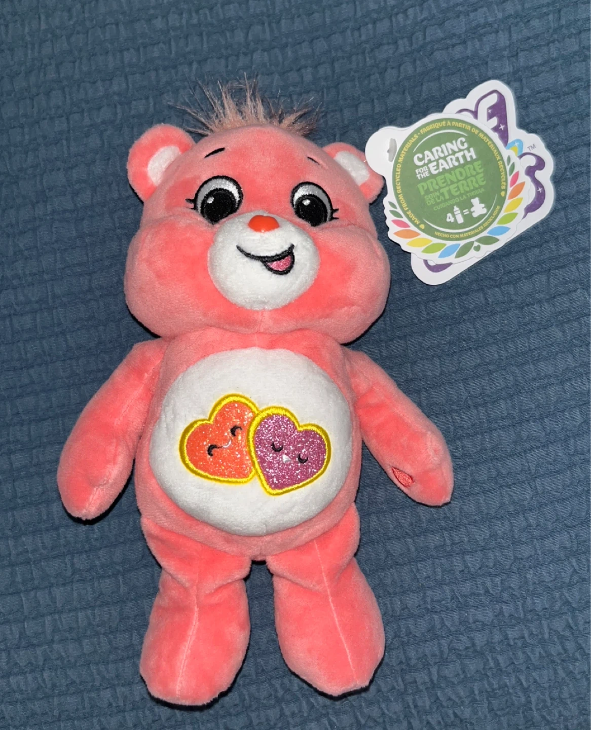 It's a soft Care Bears plush toy featuring the pink Heart Bear. This plush is made with recycled materials, perfect for cuddling. It's a great gift for fans of Care Bears!