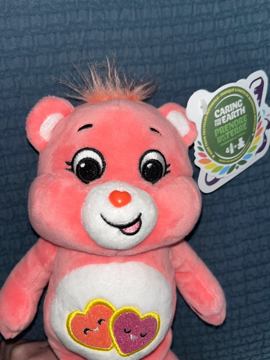 It's a soft Care Bears plush toy featuring the pink Heart Bear. This plush is made with recycled materials, perfect for cuddling. It's a great gift for fans of Care Bears!
