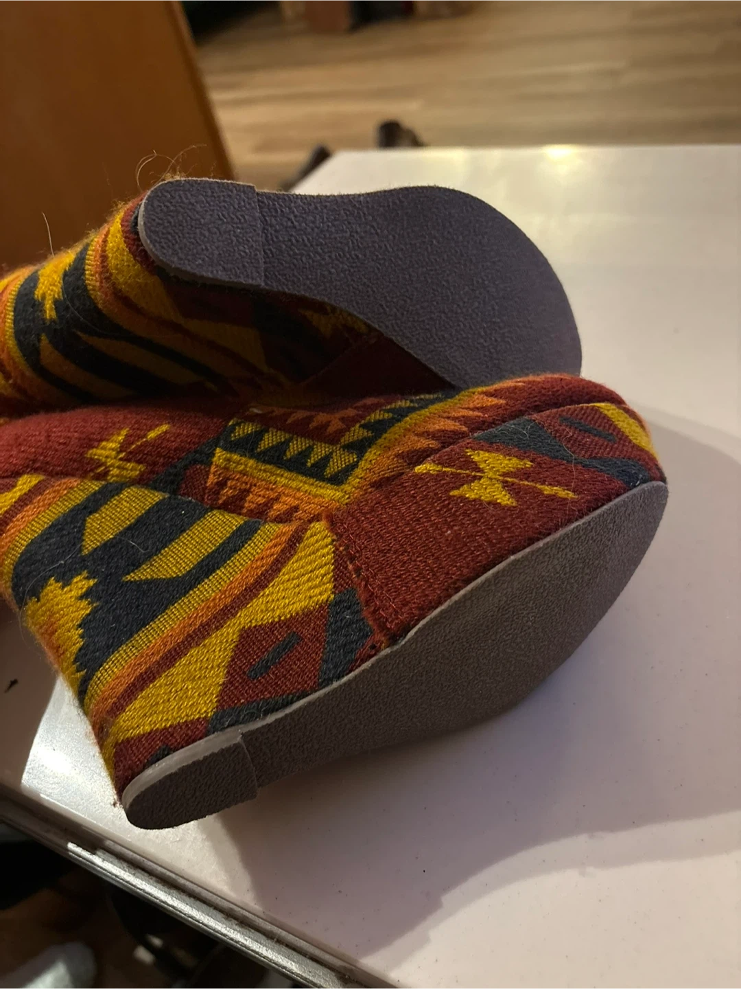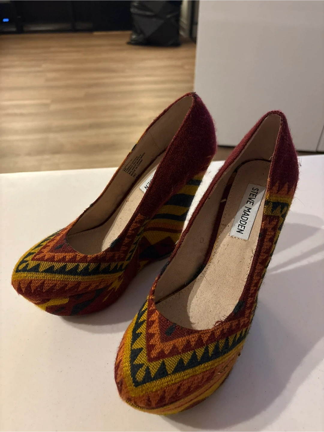 Unique Steve Madden wedge heels with a bold woven geometric pattern in warm tones. A standout pair that adds personality to any outfit.