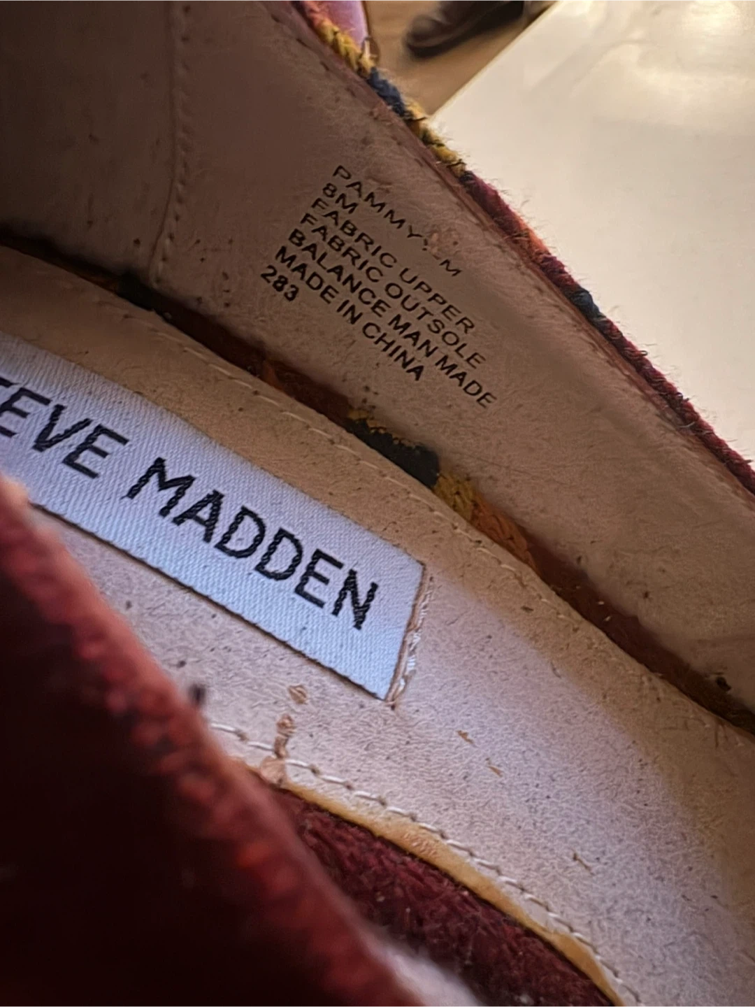 Details:• Brand: Steve Madden• Size: Women’s 8• Colour: Red / mustard / black patterned fabric• Style: Platform wedge heel• Comfortable closed-toe design