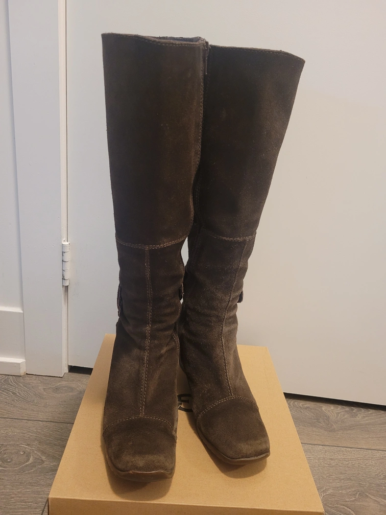 Brown suede wedge boots with a side zipper and a button detail. Worn but in good condition. made in Romania