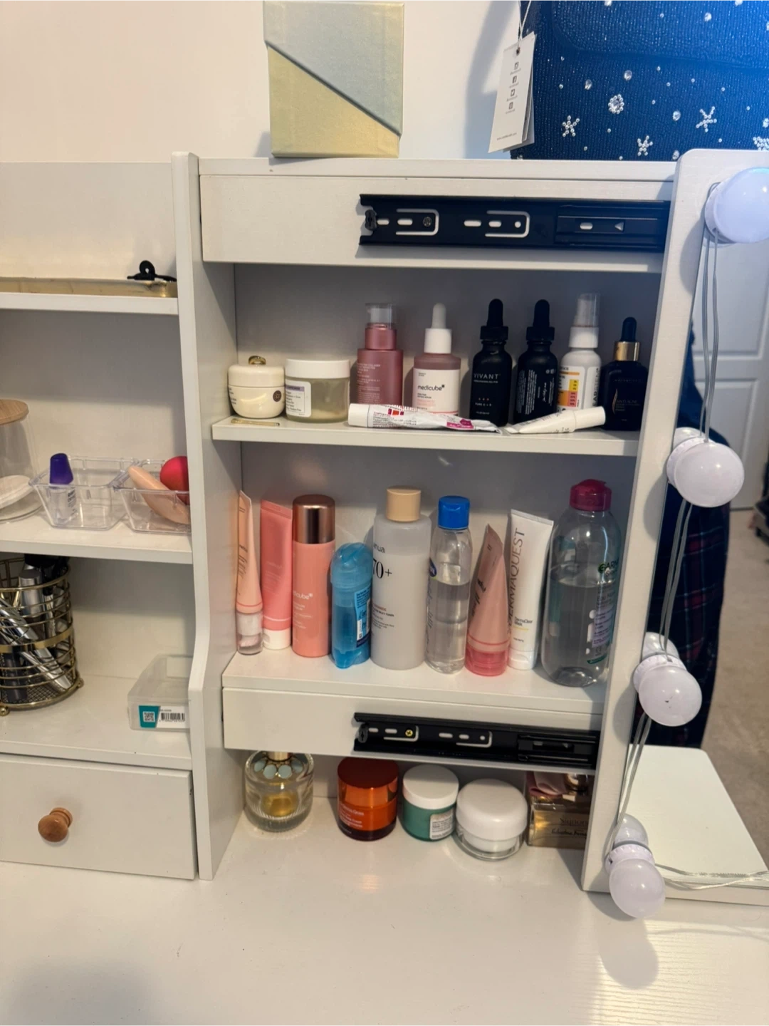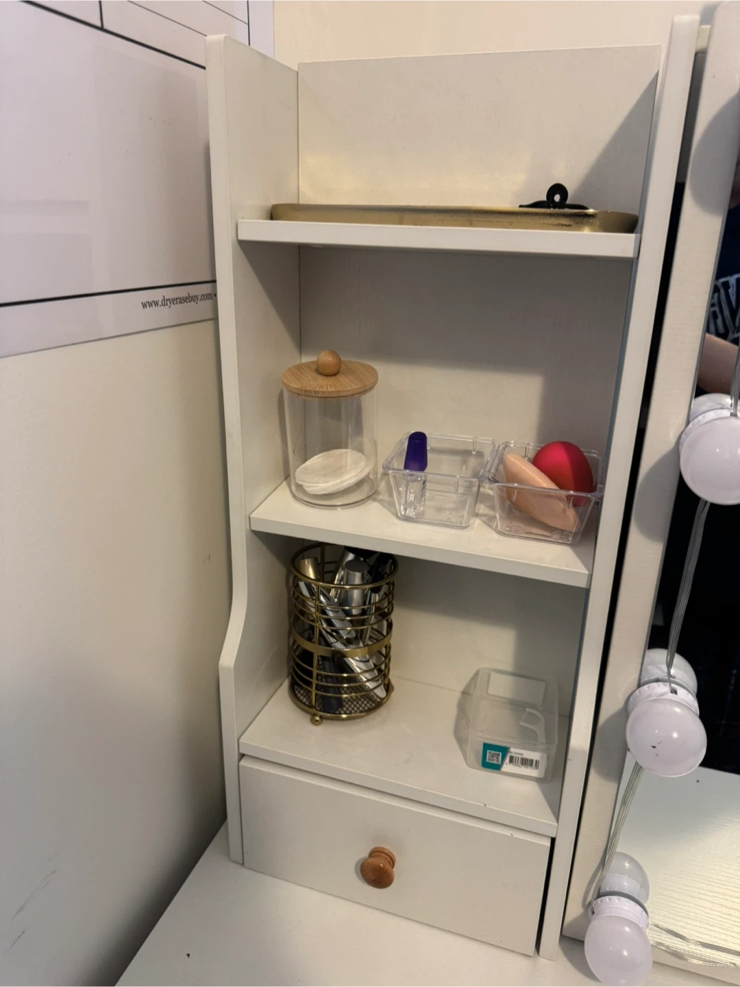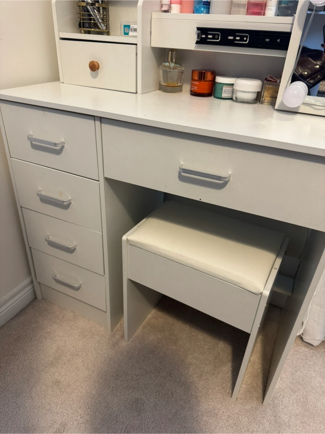 This white vanity dressing table features a mirror with built-in lights. It includes a cushioned stool and multiple drawers for storage. Its compact design makes it a great addition to any bedroom!